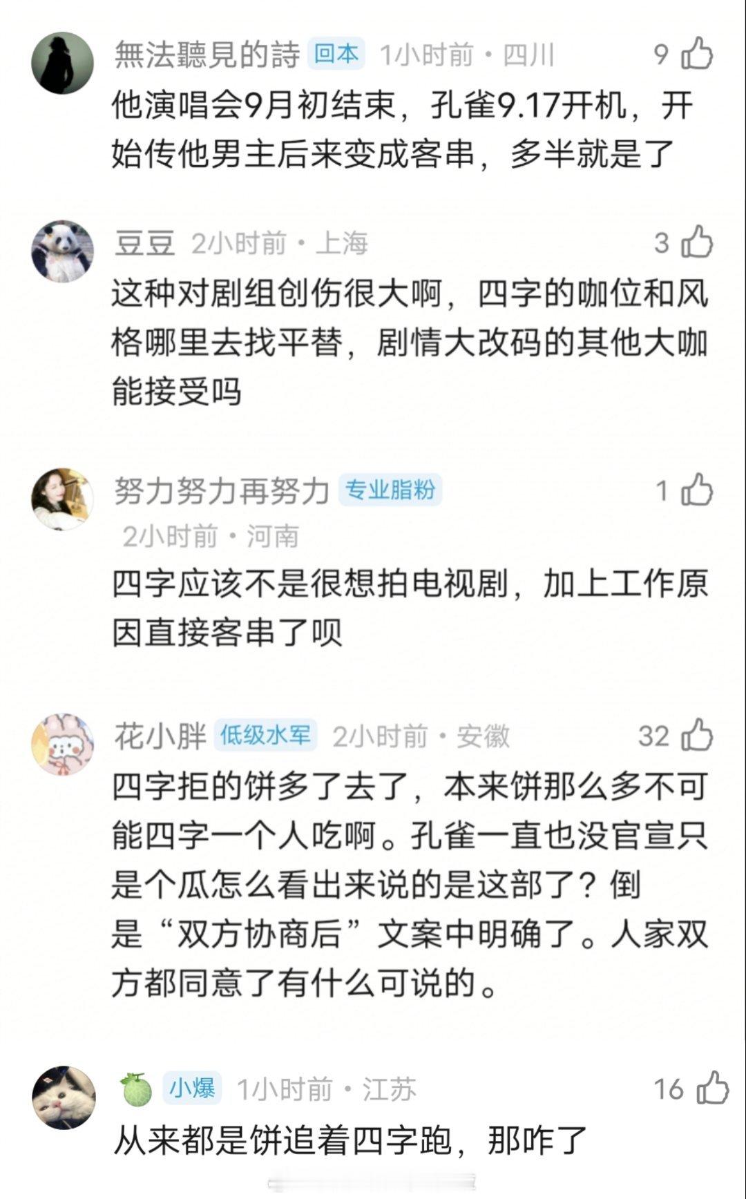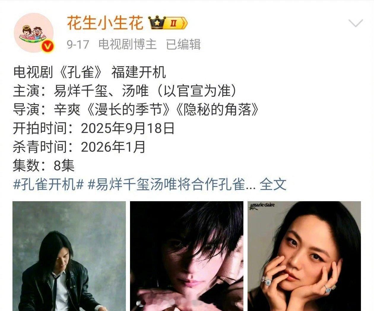 易烊千玺在采访中自曝因为身体原因,终止了原定的进组安排。网友猜测他说的是辛爽导演的《孔雀东南飞》,演唱会9月初结束,孔雀9.17开机。原本的安排是易烊千玺一番主演搭档汤唯,后面可能因为行程和身体原因只能推掉变成友情客串。易烊千玺因身体原因终止原定进组安排