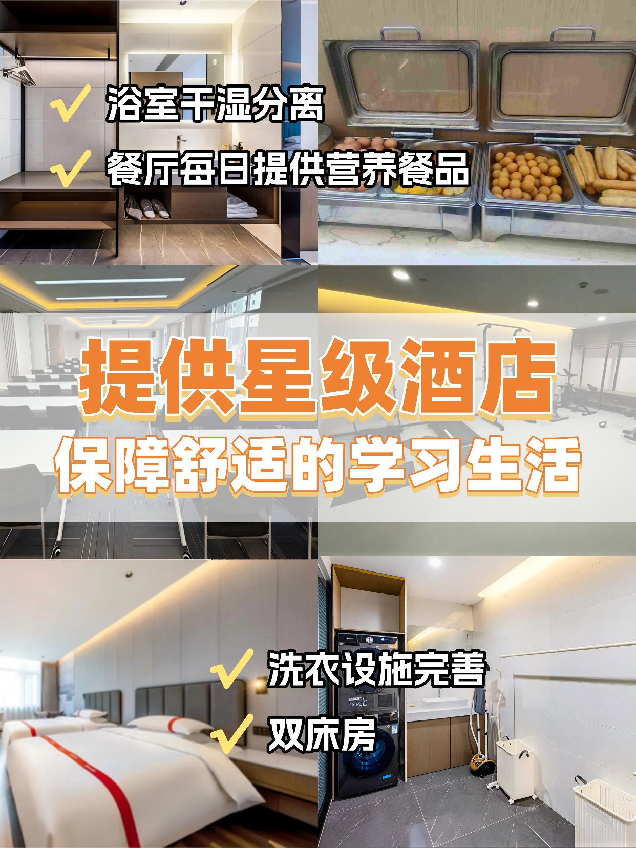 ✅贴心后勤保障:星级住宿体验,24小时热水供应、独立空调、卫浴、网络、以及洗衣房一应俱全,24h安保,保障安全,让你专注学习无后顾之忧。