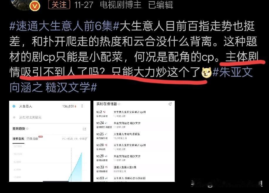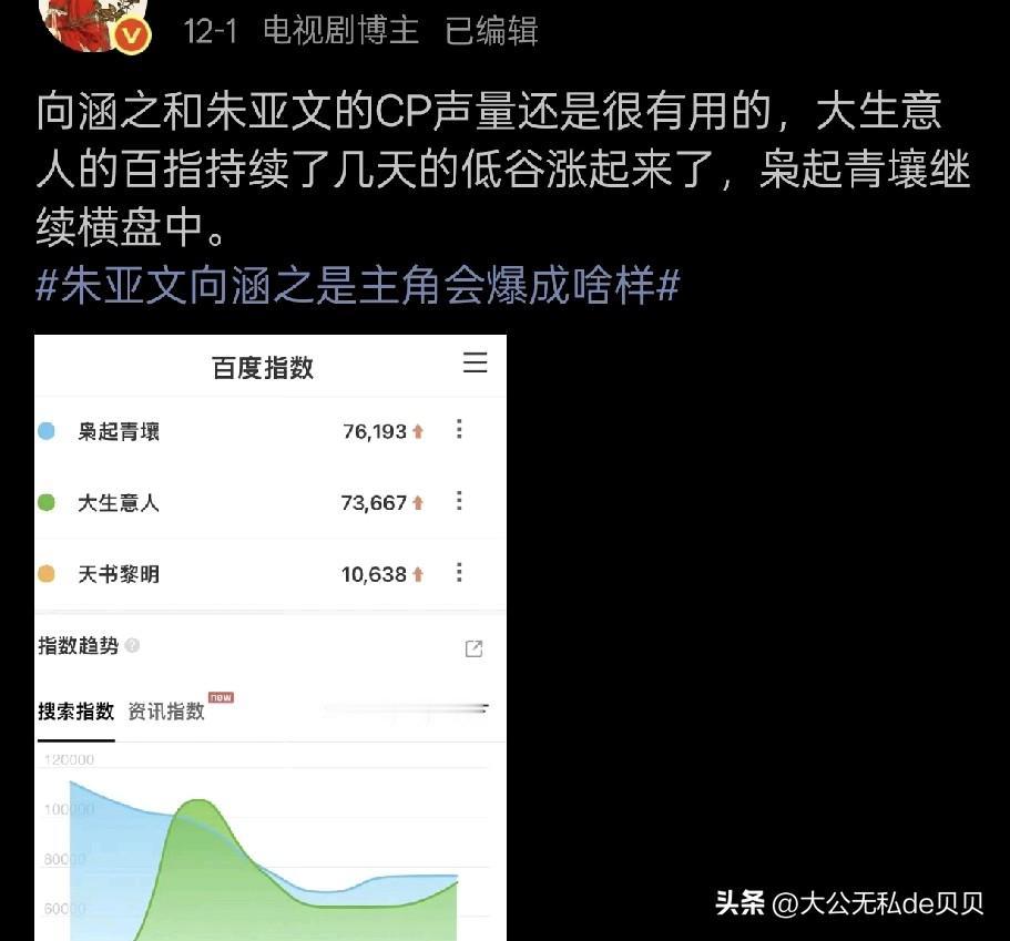 朱亚文几集的戏份,风头差点盖过了大男主陈晓,难怪他粉丝不高兴呢。 已经看到好几个内涵1️⃣❤️营销大户的评论了。 但是平心而论,真的是这样的吗? 「大生意人刚开播那会,谁能想到,它会超过顶流🌸热巴的新剧?」 两部剧开播时间差不多,热巴那部首日百指8万多,陈晓这部3000多。 如今播出过半,两部剧的百指基本持平,足以证明,朱亚文和向涵之的加持作用。 主线CP炒不起来,那肯定要转变思路推销副线CP啊。 这跟1️⃣❤️应该没多大关系,跟朱亚文更没关系,是剧组和平台的一种营销手段罢了。 朱亚文 冬日生活打卡季
