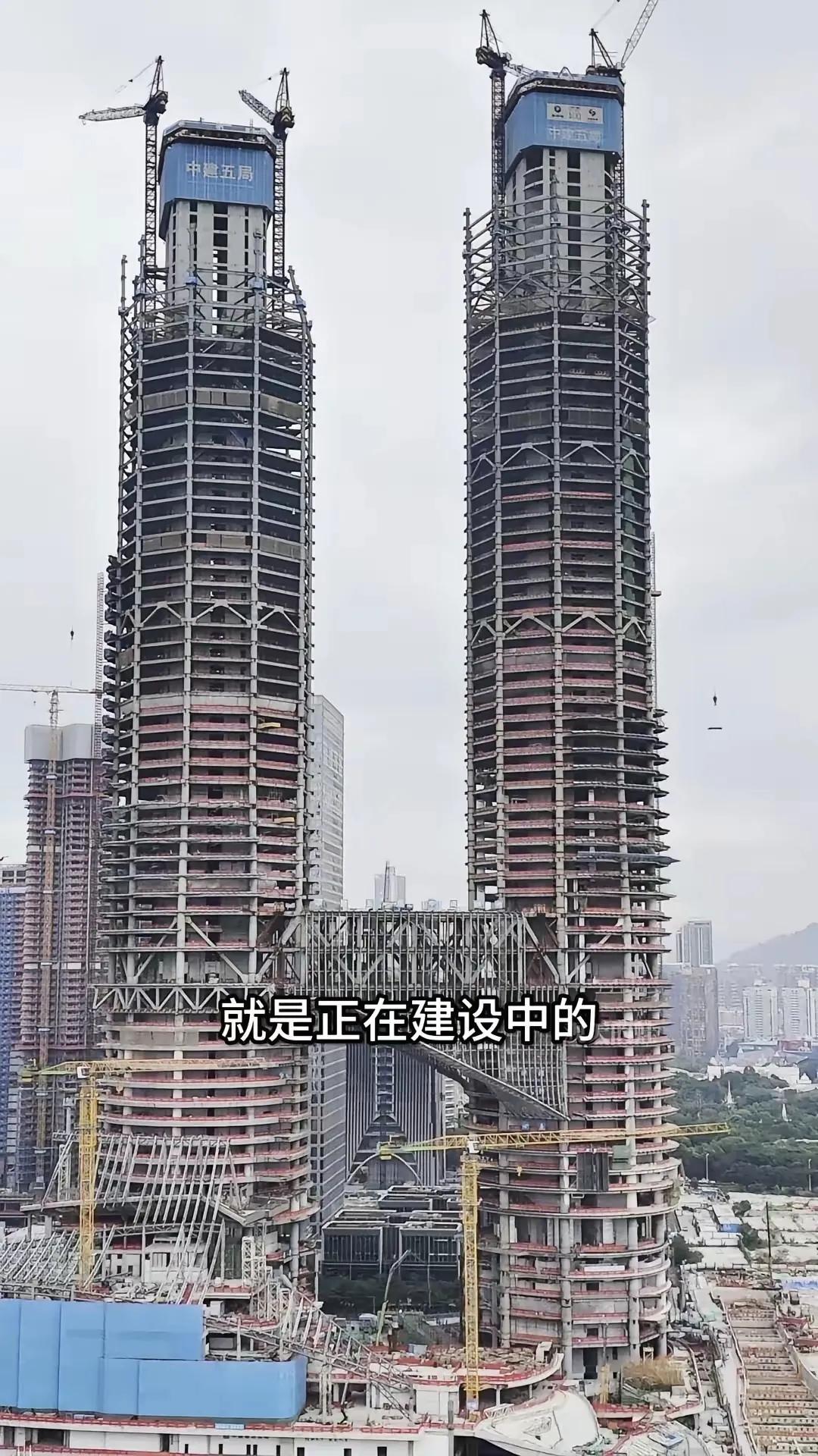 全国最高超连廊双子塔,这个连廊桥的钢结构有4千吨,也是世界之最了吧!连廊处有快两百米高了,深圳超级双塔,最高的392米,另外一幢330米不到,相差60来米,不算是等高双子塔,是国外设计师设计的,真的是钱烧的啊!这个项目投资达165亿,算是投资最多的双塔了吧!深圳真的是有钱的地方,预计2027年底投入使用,到时候超过建成的深圳双塔了,以上仅供参考,属个人意见!