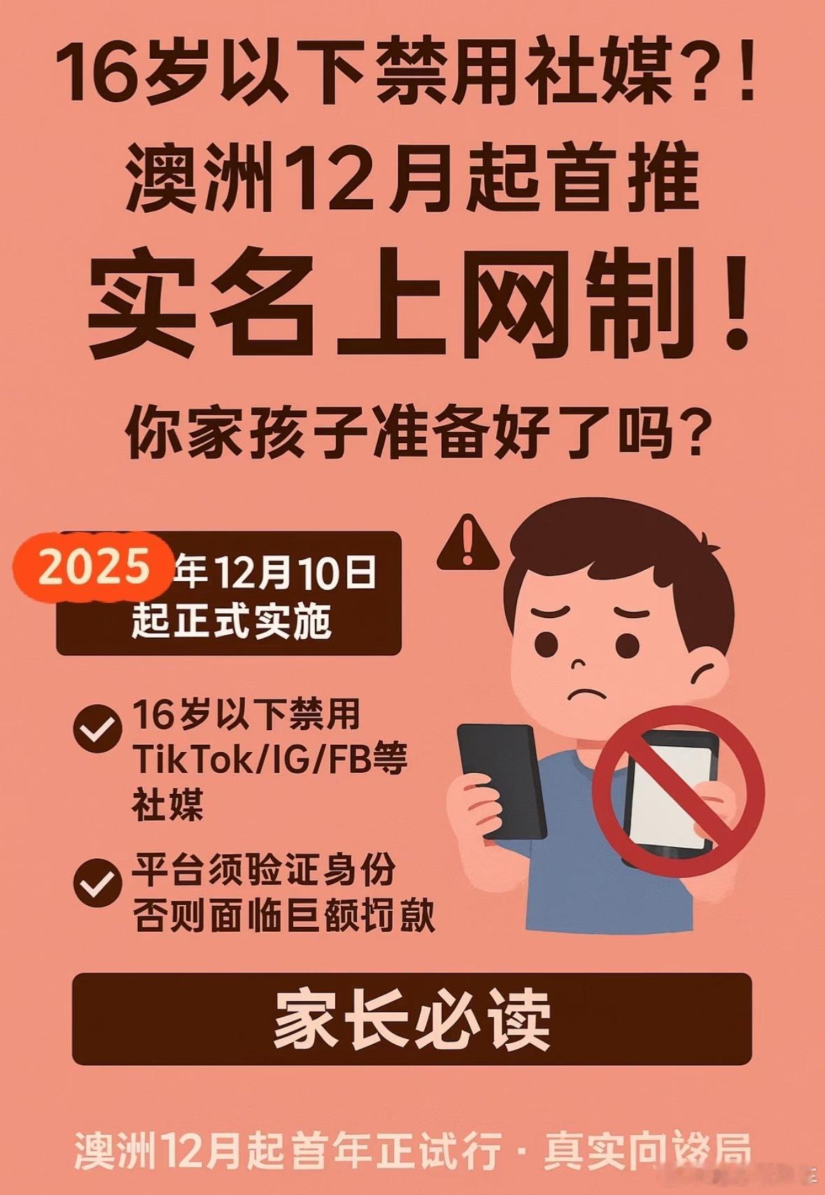全球最严禁令来了!12月10日起,澳16岁以下禁用TikTok、INS等主流社媒,违规平台最高罚4950万澳元😂 初衷是护娃防霸凌、保心理健康,77%家长举双手支持。但争议拉满:专家担心娃会转去无监管小众软件,反而更危险。保护和自由的平衡,果然难拿捏!你觉得该一刀切吗?