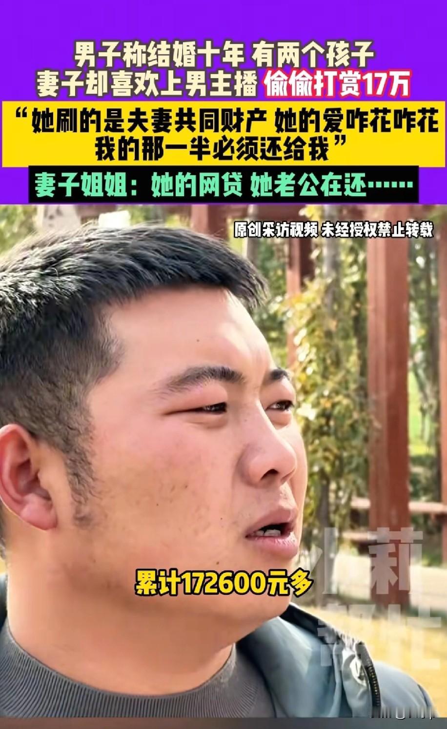 郑州女子瞒着丈夫打赏主播17万 男子找到主播公司要求退还打赏的一半 因为他妻子打赏的是他们夫妻共同财产 本来因为买房子有了外债,因为打赏主播又借了网贷,现在都是她丈夫在还 结婚都十年了,也有了俩孩子 这位女子也是没谁了,话又说回来 主播有没有责任呢?他是怎么加上这位女子的微信呢,结果不言而喻,就是想通过平常暧昧的聊天达到长期稳定的打赏,他们以为她可能是个富婆 现在知道了她并不是 现在还面临着退款的责任 平时看看就得了,大家挣钱都不容易 这么多钱留着给自己的孩子不好吗