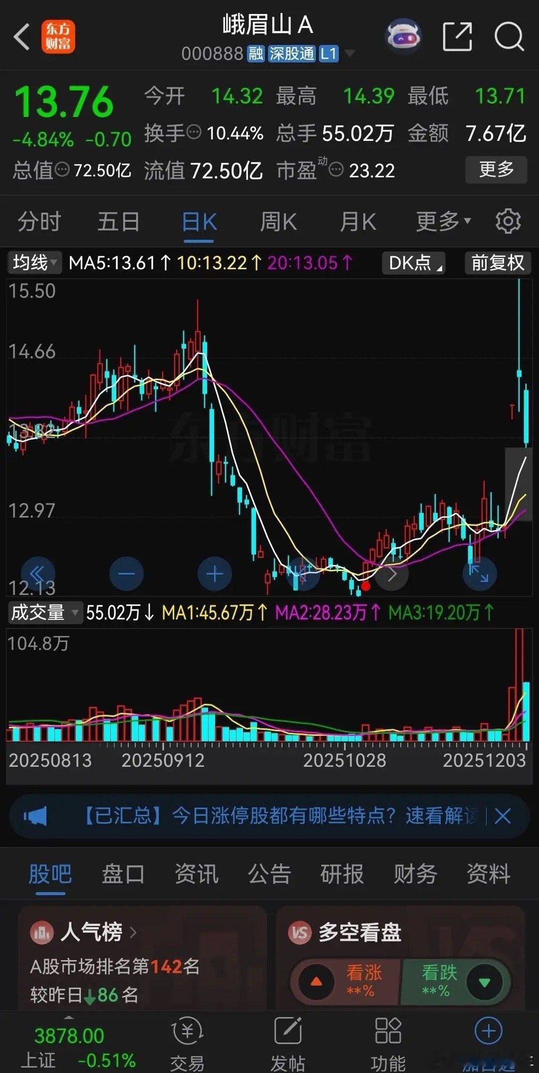 峨眉山这算盘打得啪啪响!上周末峨眉山放出大招,持股500股以上的股东免门票,还可享免费温泉、滑雪 住酒店打折等!随行亲属也有优惠。这个消息一出,迅速冲到各大财经平台人气排行榜榜首的位置,果不所然,周一峨眉山一字涨停开盘,全天涨停板被牢牢封死。周二盘中一度大涨超过9%,不过一波急拉过后,又快速回落,收盘只涨了2个多点。而昨天低开低走,下跌4.84%,股价又快跌回了原形。但这些都不重要,这三天成交了近30亿元,快接近公司市值的一半了。公司出名了,人气也旺了,这几天进场的股民,无论盈利还是套牢,总算有张免费的门票了,接下来该去消费了,公司的目的也达到了,一个双赢的局面,皆大欢喜!