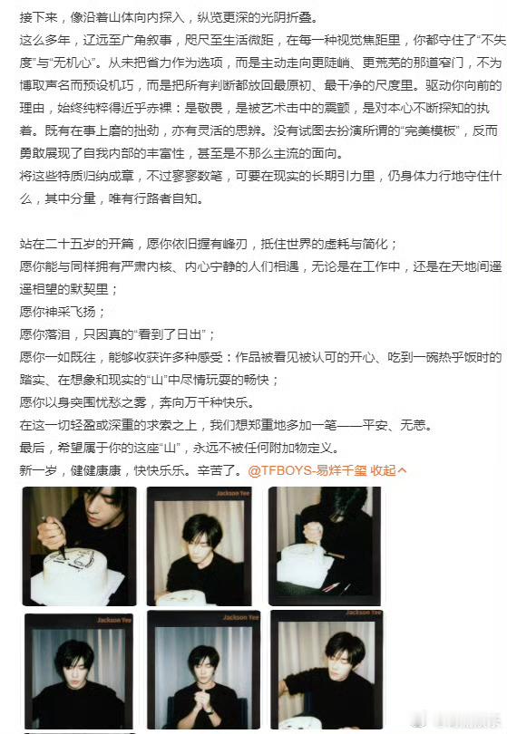 易烊千玺工作室发长文 12月4日,发长文:站在二十五岁的开篇,愿你依旧握有峰刃,抵住世界的虚耗与简化;愿你能与同样拥有严肃内核、内心宁静的人们相遇,无论是在工作中,还是在天地间遥遥相望的默契里;愿你神采飞扬;愿你落泪,只因真的“看到了日出”;愿你一如既往,能够收获许多种感受:作品被看见被认可的开心、吃到一碗热乎饭时的踏实、在想象和现实的“山”中尽情玩耍的畅快;愿你以身突围忧愁之雾,奔向万千种快乐。在这一切轻盈或深重的求索之上,我们想郑重地多加一笔——平安、无恙。最后,希望属于你的这座“山”,永远不被任何附加物定义。新一岁,健健康康,快快乐乐。辛苦了。易烊千玺工作室