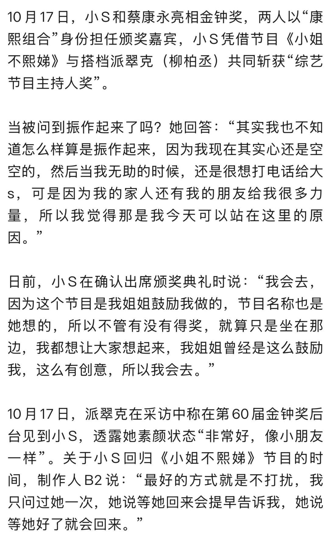 此前,小S因姐姐大S于2025年2月离世深受打击,随即向节目《小姐不熙娣》请假半年,暂别主持工作。该节目由吴姗儒代班主持,小S确认出席10月17日金钟奖颁奖典礼,凭借《小姐不熙娣》入围综艺节目主持人奖,这是她停工后首次公开亮相,被视为复出的重要信号。