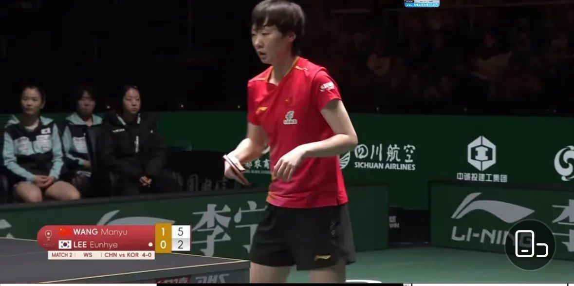 成都混团 中国VS韩国 王曼昱3:0李恩惠 马琳指导暂停叫的及时!12月4日,成都混团世界杯第二阶段中国目前6:0韩国第一盘林诗栋/蒯曼3:0朴康贤/金娜英11:5,14:12,11:8第二盘王曼昱3:0李恩惠11:7,11:7,11:8今天动漫的表现值得表扬,特别是第二局比赛,在非常困难的情况下,顽强拼搏,硬是没让韩国队拿到一分,这就团魂!王曼昱今天打的也是非常正常,特别是第一局,曼昱想偷发一个长球,太长了,出界,紧接着李恩惠最后关头也发球失误……第三局,马琳指导的暂停叫的好!乒出精彩