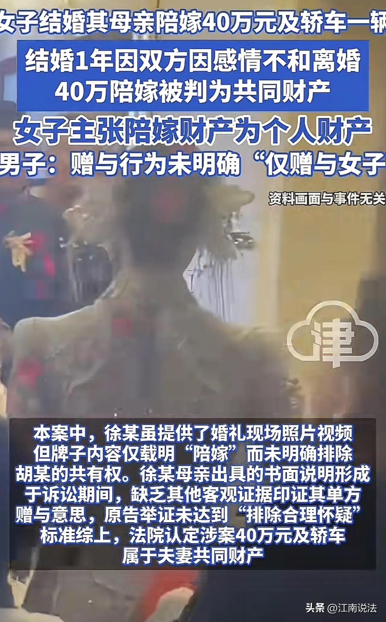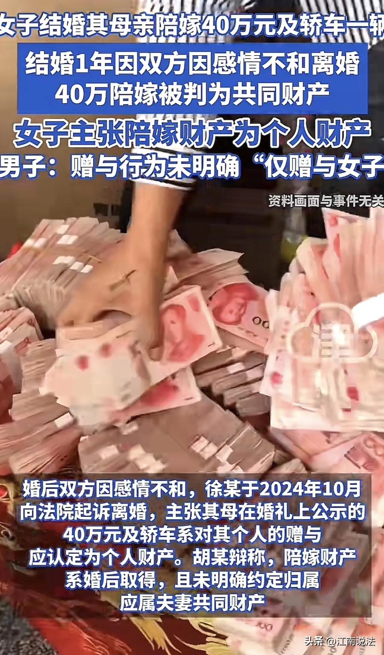 山东一女子嫁入夫家时,娘家豪气赠送了一辆汽车和40万元现金,按理说这是对新婚生活的美好祝福和强有力支持。然而,不到一年时间,夫妻双方因感情破裂吵着离婚。眼看这段婚姻走到尽头,围绕那辆汽车和40万元的归属问题,夫妻双方激烈争执。 女子坚持认为,汽车和钱款皆为娘家赠予她个人的财产,不属于夫妻共同财产,离婚时应当全数带回娘家;丈夫却坚决反对,认为婚后夫妻共有的这笔财产,理应作为共同资产平等分割。矛盾升级,最终诉诸法院。 这起看似简单的财产分割案,却挑战了传统观念与现代法律的边界。在传统社会氛围里,陪嫁往往被视为“娘家的私房钱”,属于女方个人;但法律在具体判定时,必须结合赠与的对象、时间及夫妻双方的实际使用情况来综合判断。 法院最终作出令人意外的判决,既没有完全支持妻子“一毛不拔”的诉求,也未简单地认定为夫妻共同财产。判决强调,陪嫁财产的性质并非一成不变,而应视赠与行为的具体情况和双方婚后财产状况来定夺。在该案中,法院考虑到汽车和40万元虽为娘家赠与,但女子婚后与丈夫共同生活,部分资金和资产用于家庭开销,因此判决将部分财产作为夫妻共同财产处理,另一部分认定为妻子个人财产。 这起案件不禁让我们思考:随着社会发展,婚姻中的财产界限日益模糊,传统的“陪嫁就是女方个人”观念已经难以完全适用。夫妻间的信任与公平需要法律的理性调节,而非仅靠情感和习俗。 更重要的是,它警示每一个即将步入婚姻或已婚的人:婚前财产如何界定,夫妻间如何建立透明的财务沟通机制,是保障婚姻健康的重要课题。否则,当感情出现裂痕时,经济问题往往成为最后的导火索。 你怎么看这场围绕陪嫁展开的财产争夺?陪嫁究竟应属个人还是夫妻共有?你的婚姻中是否也存在类似的“财产雷区”呢?欢迎留言分享,让我们一同探讨法律与情感交织下的现实困局与解决之道。毕竟,每一段婚姻,都需要理智与温情并重,财产之外,更要守护彼此的信任和尊重。女儿出嫁彩礼 女方的结婚陪嫁 山东农村彩礼