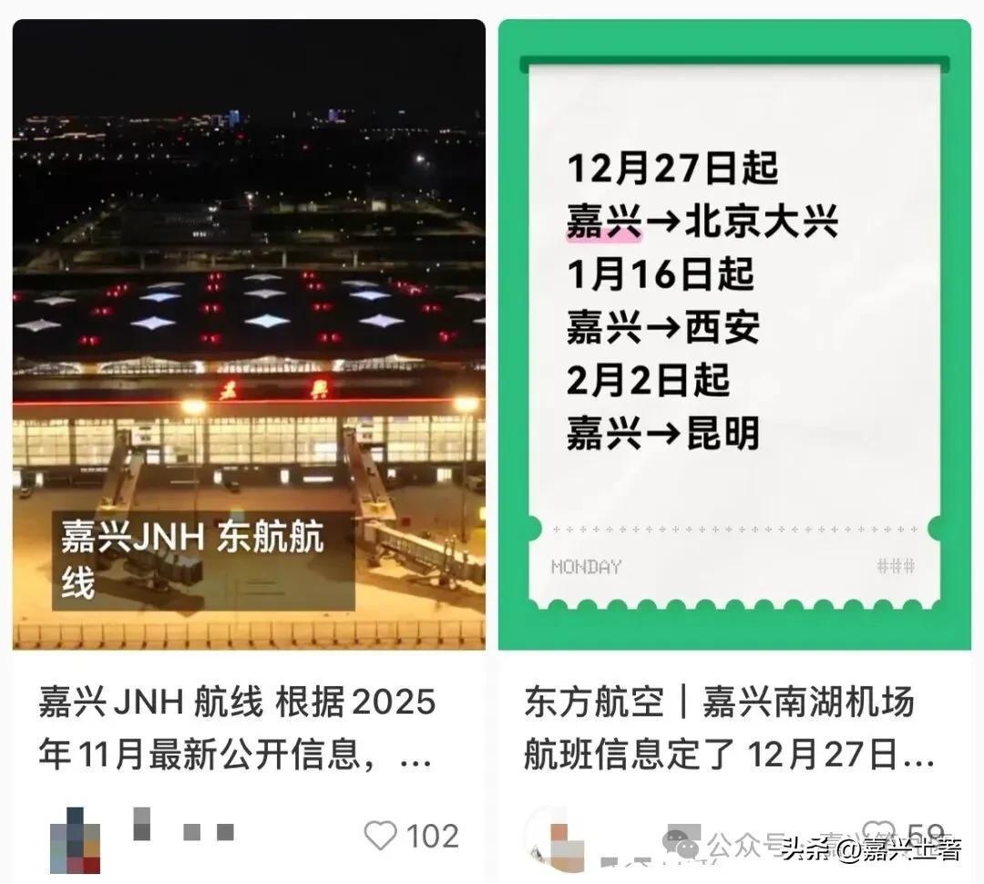 嘉兴南湖机场部分航班号、时间曝光?基本上都是下午的航班! 昨天开始, 嘉兴机场航班消息一点点在流出来, 东方航空执飞线曝光后, 今天又流出了长龙航空的! ↓↓↓ @第九区网友爆料: 昨天东方航空曝光,今天长龙的也被曝光! 长龙航空APP已经更新, 嘉兴出发的目的地深圳、成都双流、长春, 还有航班号和起飞时间也有了, 基本上是下午的航班! 昨天东航航线说, 12月27日开始通航, 12月27日起嘉兴北京大兴往返, 1月16日起嘉兴西安往返, 2月2日起嘉兴昆明往返, 都是每日1班! 目前,机场首批拟开通 嘉兴至北京(大兴)、广州、 深圳、成都(双流)、长春等航线, 2026年春运将陆续开通哈尔滨、海口、 重庆、西安、昆明等航线 (注:具体开航方案以民航局批复意见为准)。 评论区一起说说, 你期待能飞哪个城市!