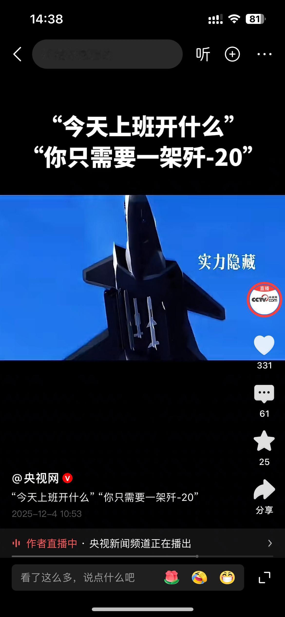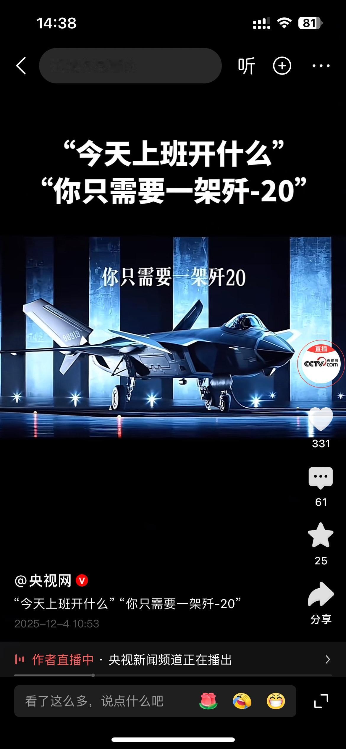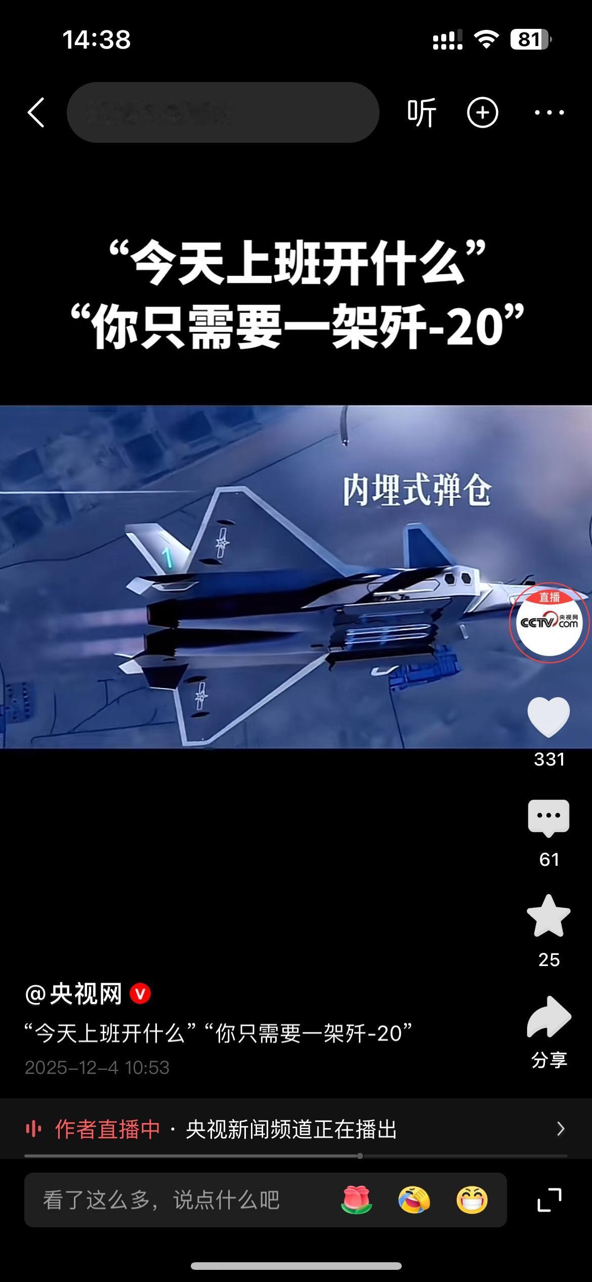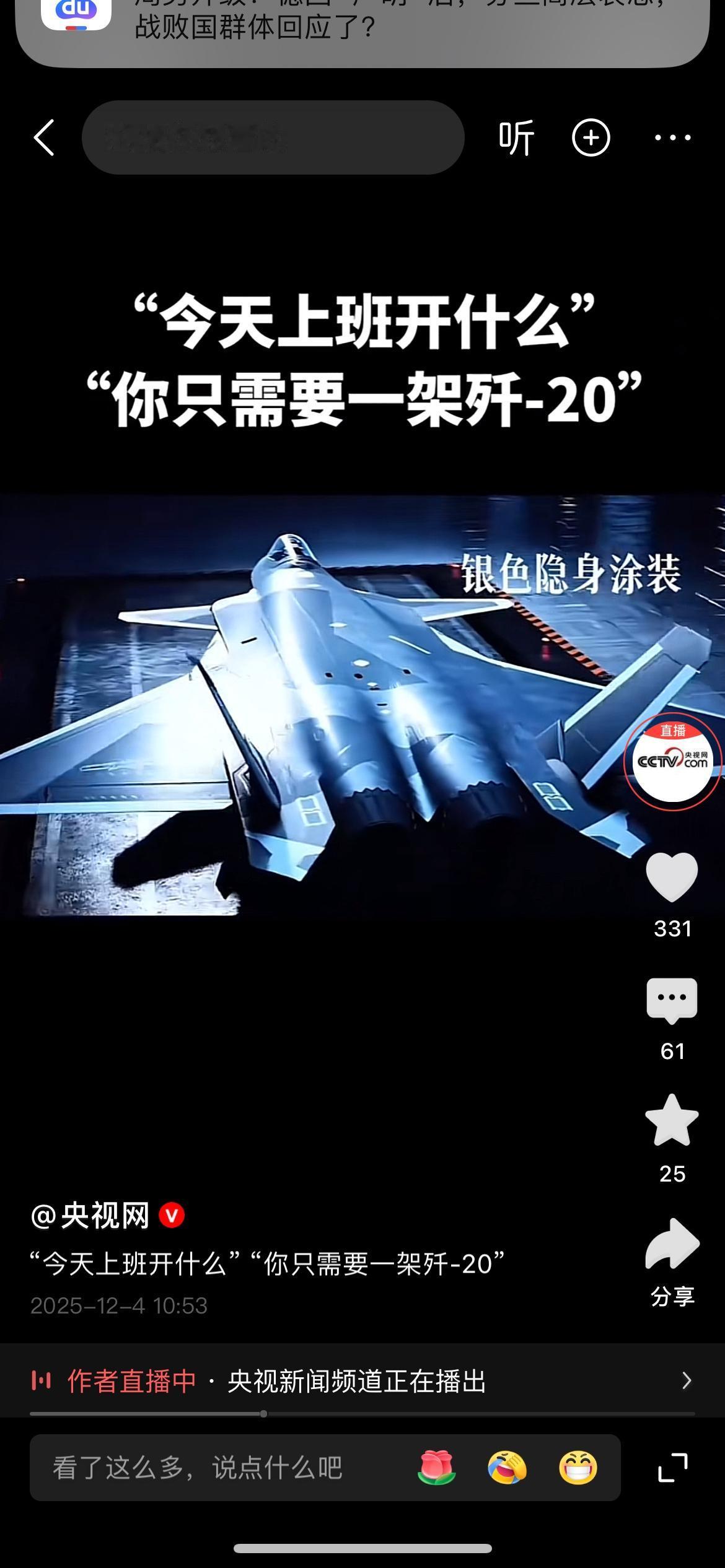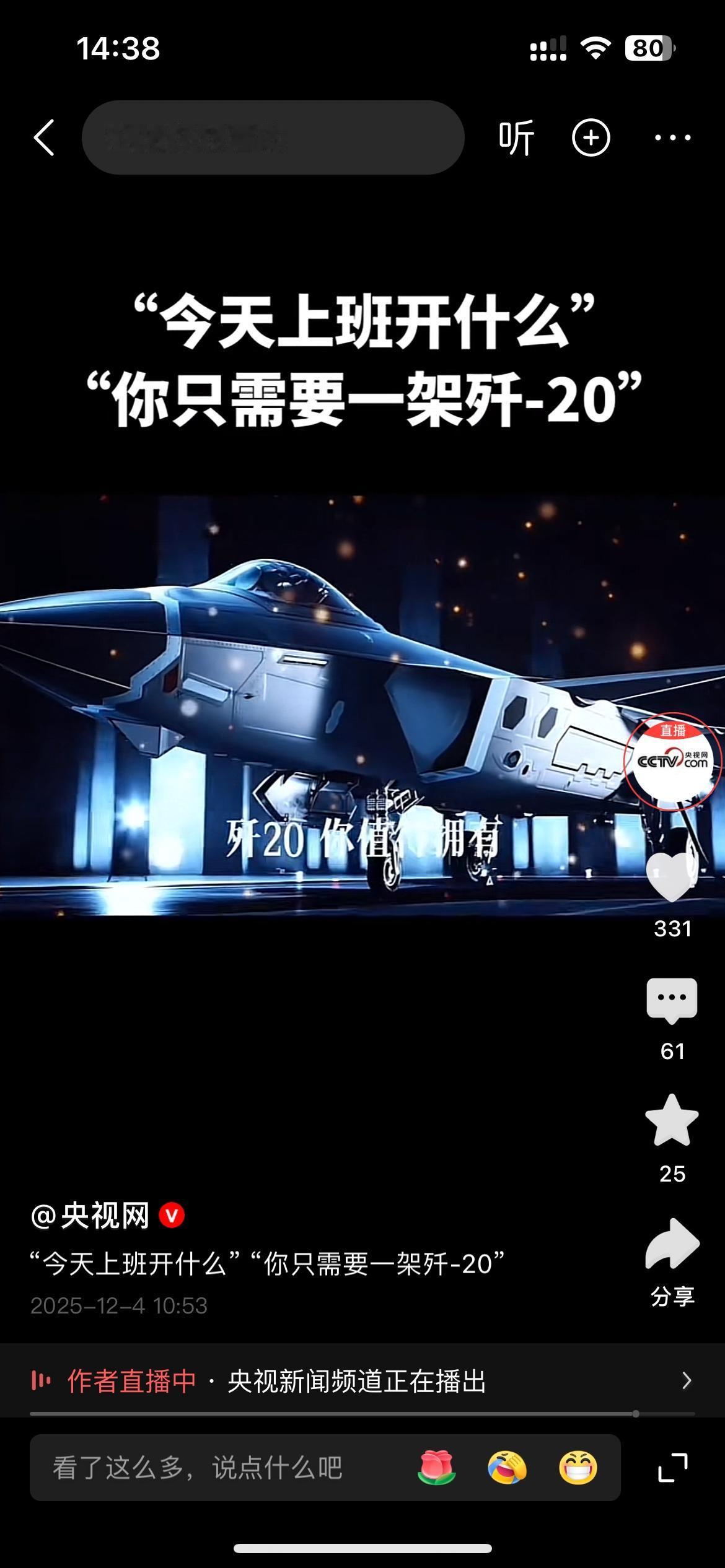 今天上班开什么?歼-20你值得拥有!这是官媒央视网为歼-20打的广告,既然央视都说了,歼-20你值得拥有! 那就想问问,歼-20真的可以放开让个人买吗?如果真的可以,感觉国内能买得起歼-20的大佬应该也不少,买一架歼-20开着上班,要比波音、空客、湾流、直升飞机等私人飞机更拉风!