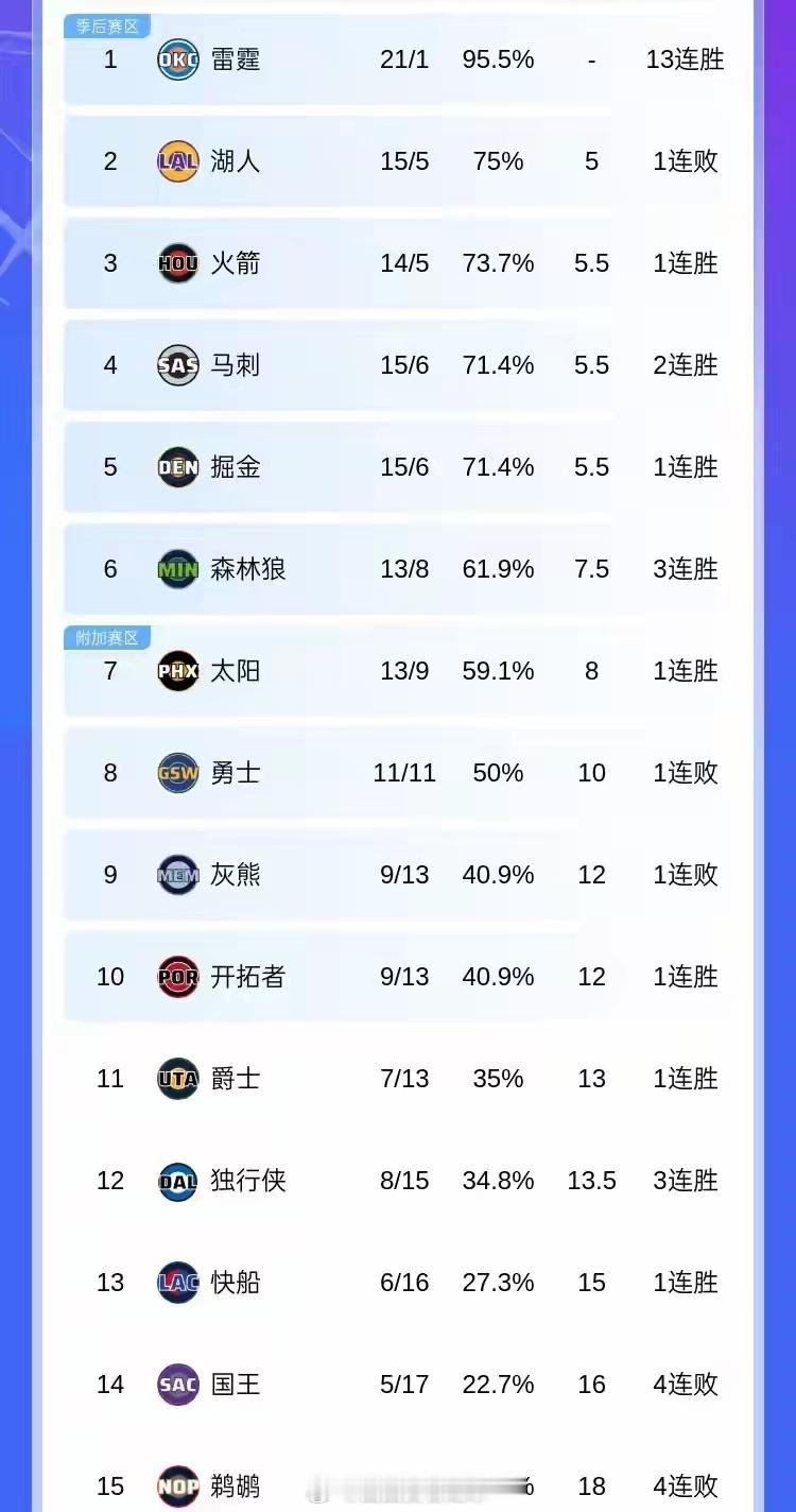 NBA西部多场对决后排名重塑,雷霆21胜1负独霸榜首。火箭121-95大胜国王、掘金135-120轻取步行者(穆雷52+10三分)、马刺114-112绝杀魔术,三支球队战绩紧咬。湖人、火箭、马刺、掘金位列2-5名,胜场差仅0.5,快船终结五连败仍居第13。