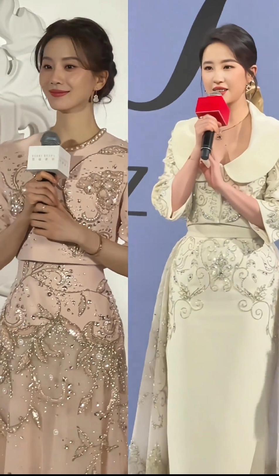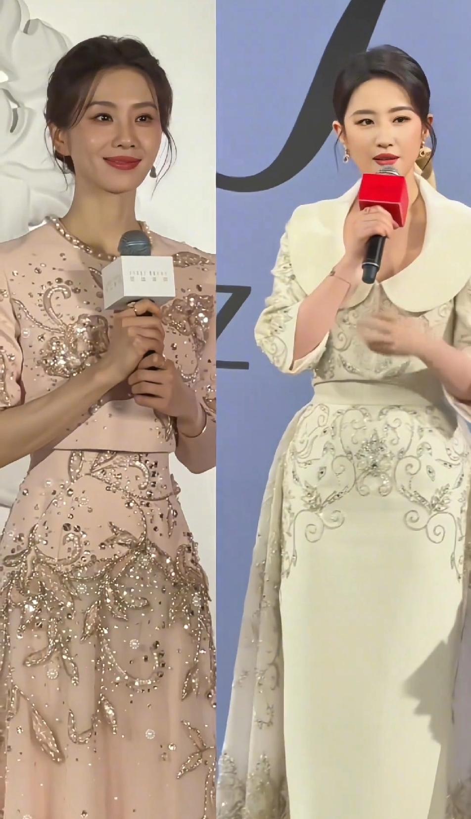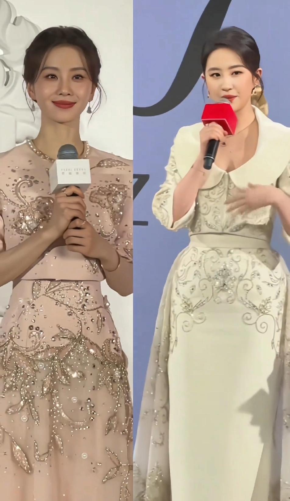 刘诗诗更适合温婉优雅的礼服,刘亦菲更适合大气华丽的礼服,款式类似的小套装,刘诗诗看起来更雅致俏丽,刘亦菲就是端庄成熟,但如果说谁让人眼前一亮,那还得是刘诗诗,总觉得刘亦菲的气质不适合小套装,她的身架和气质都太大气,这样的小套装刘亦菲穿起来够端庄,但少了点秀丽和灵动~~刘亦菲 刘诗诗