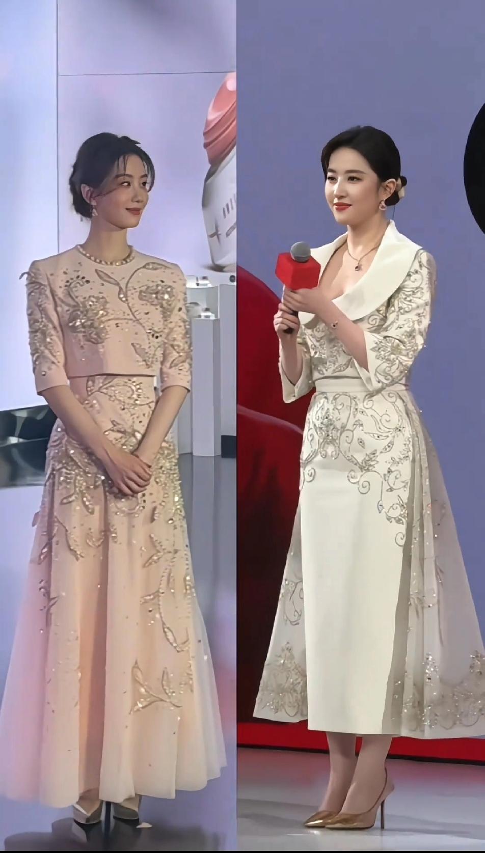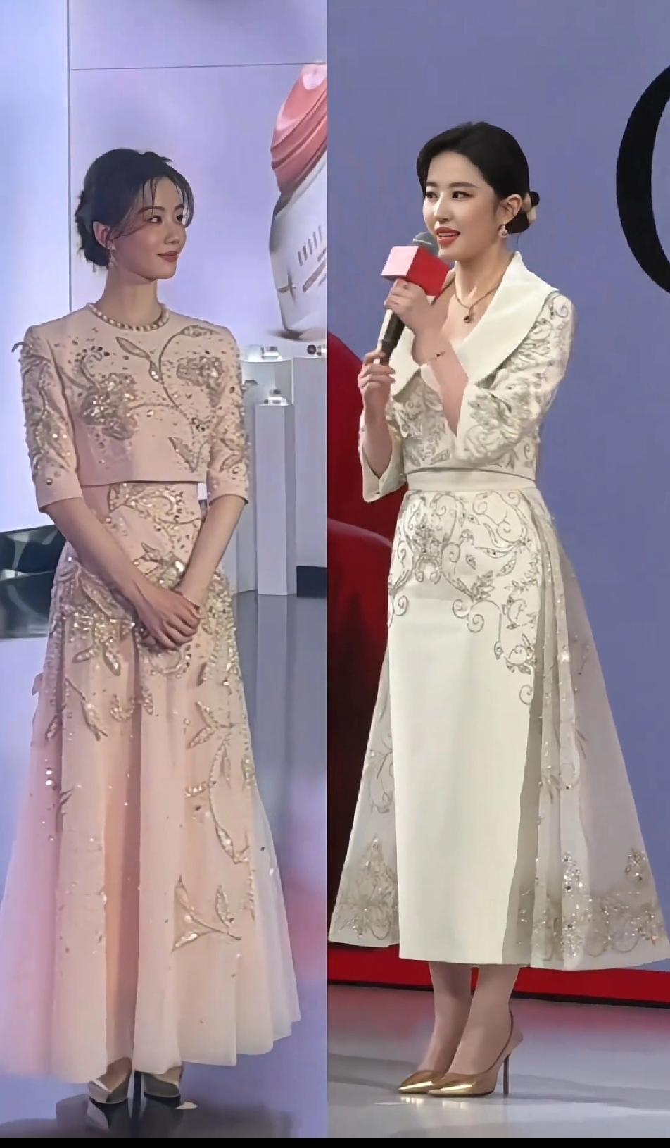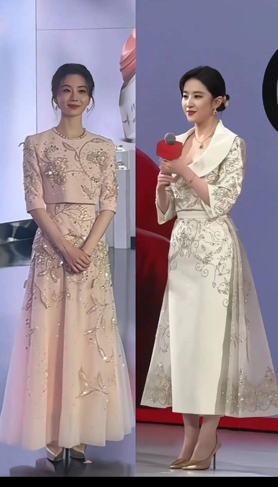 刘诗诗更适合温婉优雅的礼服,刘亦菲更适合大气华丽的礼服,款式类似的小套装,刘诗诗看起来更雅致俏丽,刘亦菲就是端庄成熟,但如果说谁让人眼前一亮,那还得是刘诗诗,总觉得刘亦菲的气质不适合小套装,她的身架和气质都太大气,这样的小套装刘亦菲穿起来够端庄,但少了点秀丽和灵动~~刘亦菲 刘诗诗