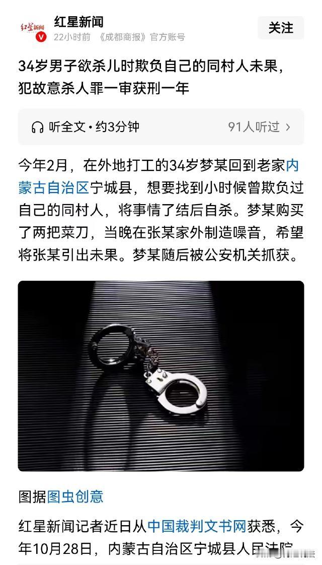 内蒙古赤峰,34岁男子小时候遭到过同村人欺负,于是买了两把菜刀,想要杀 掉对方将此事了结,然后再自杀,结果对方一直待在房间里不出来,男子打砸车辆后离开。第二天对方报警,男子因故意杀人罪获刑。 据红星新闻报道,34岁男子梦某老实怯弱又固执,容易钻牛角尖,2025年2月5日,梦某回到老家宁城县。 因工作生活不顺,梦某再次钻了牛角尖,他认为,自己成为这个样子,都是因为小时候同村的张某欺负自己导致的。 梦某觉得活着没什么意思,产生了报复张某的念头。于是,他买了两把菜刀,准备杀 掉张某,然后自己再自 杀。 随后,梦某找到张某家里,质问他小时候为什么欺负自己,张某说,自己从来没有欺负过他,让他不要没事找事。 梦某大怒,和张某大吵一架,并坚定了杀 掉张某的想法。 当天晚上9点多钟,梦某手持菜刀和一把锤子,以及塑料管和塑料桶等物,来到张某门前。 梦某看见张某门口停着两辆车,于是用锤子砸开油箱盖,准备用塑料管将油抽出来点燃车辆,这样一来,张某家里人出来后,他就可以将他们一个一个都做掉。 抽了一会,梦某发现油箱里的油抽不出来,于是他改变策略,用锤子砸掉车玻璃和后视镜制造动静,想将张某及家人引出来。 可让梦某失望的是,他在张某家门口一直守到第二天早上6点,张某家里从始至终无人出来,早上六点梦某离开。 不久,张某出来后发现车辆被砸报了警,梦某被抓捕归案。 案发后,民警对梦某进行了精神鉴定,确认案发时他有完全刑事责任能力。 案发后,梦某的家属赔偿了张某家的损失,取得了张某及家人的原谅, 庭审时,梦某辩解称他只是想偷张某的汽油,后来发现门口有监控,才用锤子砸了车,却拒不承认自己想杀 害张某的意图。 1、梦某的行为应该如何认定? 34岁的梦某认为小时候被同村张某欺负,导致自己工作生活不顺,从而产生报复杀 人的念头,并实施了一系列行为,虽然他并未报复成功,但仍应该认定为故意杀人罪。 《刑法》第二百三十二条规定,故意杀 人的,处死刑、无期徒刑或者十年以上有期徒刑;情节较轻的,处三年以上十年以下有期徒刑。 梦某将工作生活不顺原因归咎于小时候张某的欺负,产生了杀 害张某的念头,还为此购买了两把菜刀,这表明梦某主观上具有非法剥夺他人生命的故意。 《刑法》第二十二条规定,为了犯罪,准备工具、制造条件的,是犯罪预备。对于预备犯,可以比照既遂犯从轻、减轻处罚或者免除处罚。 梦某为实施杀人计划,不仅买了菜刀,还手持菜刀、锤子,携带塑料管和塑料桶等物来到张某门前。 梦某试图抽汽油点燃车辆引出张某家人,后又砸车制造动静,这些行为均是为了创造杀害张某及其家人的条件,属于为犯罪准备工具、制造条件的范畴。 但由于张某一直待在房间未出来,梦某未能对张某的生命造成现实紧迫的危险,其杀 人行为未能着手实施,因此应认定为犯罪预备。 2、判决结果。 庭审时,梦某辩解称他只是想偷汽油,后来因张某门口有监控才改为砸车,拒不承认想杀害张某的意图。 但经查明,梦某提前买了两把菜刀,案发当天晚上携带凶器在张某门口整夜蹲守,结合张某及家属的口供,证实当天梦某去张某家后多次扬言要杀 了张某。 这些证据形成了完整的证据链,足以证明梦某的真实目的是故意杀 人。 根据《刑事诉讼法》的相关规定,对一切案件的判处都要重证据,重调查研究,不轻信口供。只有被告人供述,没有其他证据的,不能认定被告人有罪和处以刑罚;没有被告人供述,证据确实、充分的,可以认定被告人有罪和处以刑罚。 因此,法院认为梦某的辩解与庭审查明的事实不符,对梦某的辩解不予采纳。 梦某构成故意杀 人罪且处于犯罪预备阶段,但他如实供述了部分犯罪事实,根据《刑法》第六十七条规定,犯罪嫌疑人如实供述自己罪行的,可以从轻处罚。 同时,梦某家属积极赔偿了张某家的损失,取得了张某及家人的原谅,这在司法实践中属于酌情从轻处罚的情节。 综合考虑上述因素,最终,一审判梦某犯故意杀 人罪,判处其有期徒刑1年。