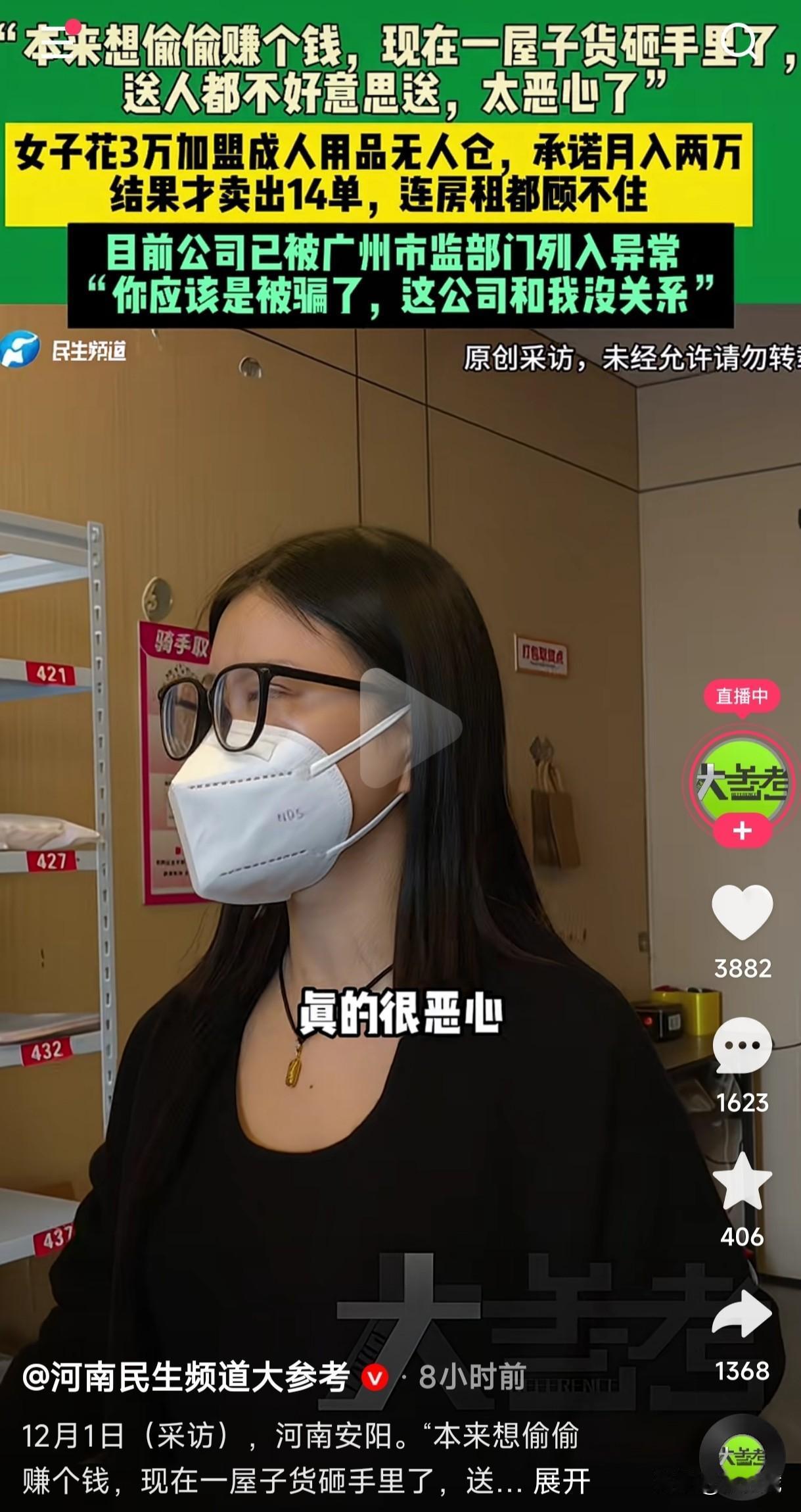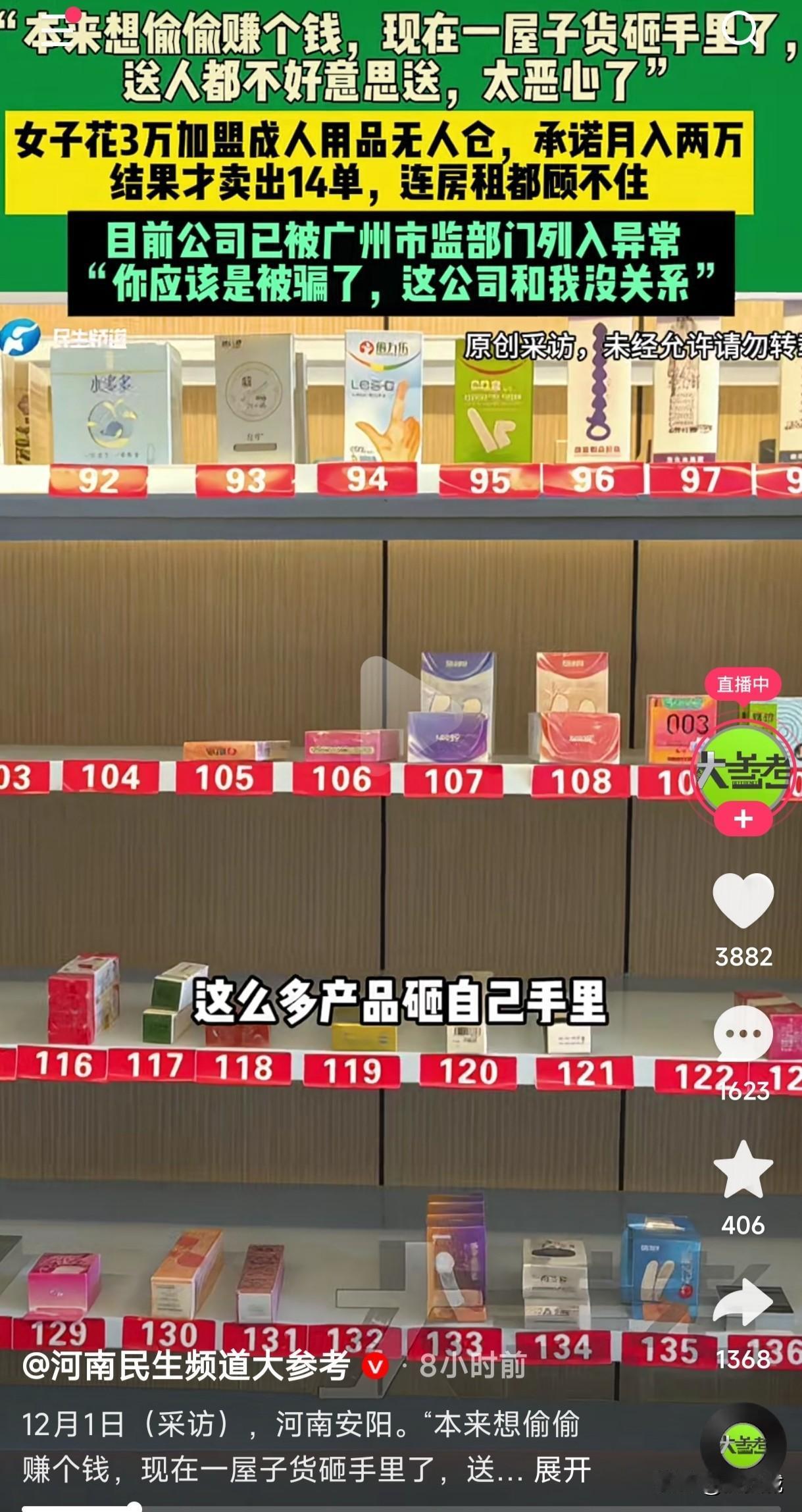 女子花3万加盟成人用品无人仓,承诺月入2万,没想到一个月才卖出14单连房租都不够,送亲戚朋友都不好意思送,本想偷偷赚个钱,没想到一屋子货全砸手里了。 成人用品无人仓听说不是很赚钱吗?月入过万根本不是问题,为什么女子加盟的这个店却无人光顾呢?究竟是她不会经营还是位置没有选对,加盟商给她承诺月入2万的,如今一个月了才卖14单,连房租都不够,更别说月入过万了,去找加盟商人家还不认,就这样稀里糊涂的被骗3万。 女子看着这一屋子成人用品一口一个恶心,这又不是吃的喝的,想送给亲戚朋友都不好意思送,然而评论区的有些网友在底下评论到,自己想要那种那种的,说实话这种东西就是白送那些亲戚朋友都感觉不好意思,是不是只能留下自己慢慢用了?