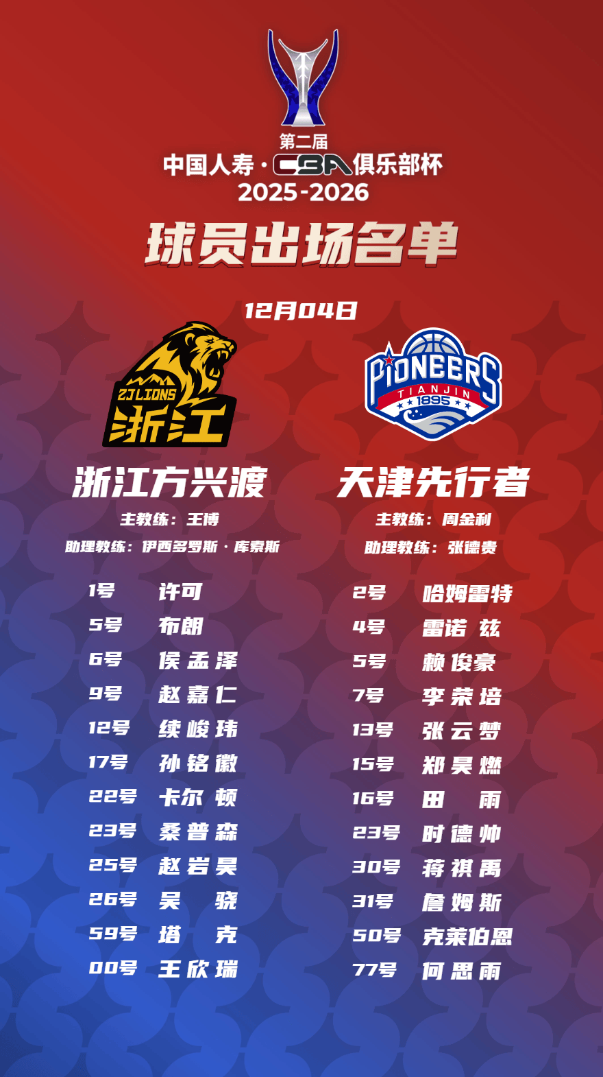 虎扑12月04日讯今日俱乐部杯,广厦男篮将对阵天津男篮。