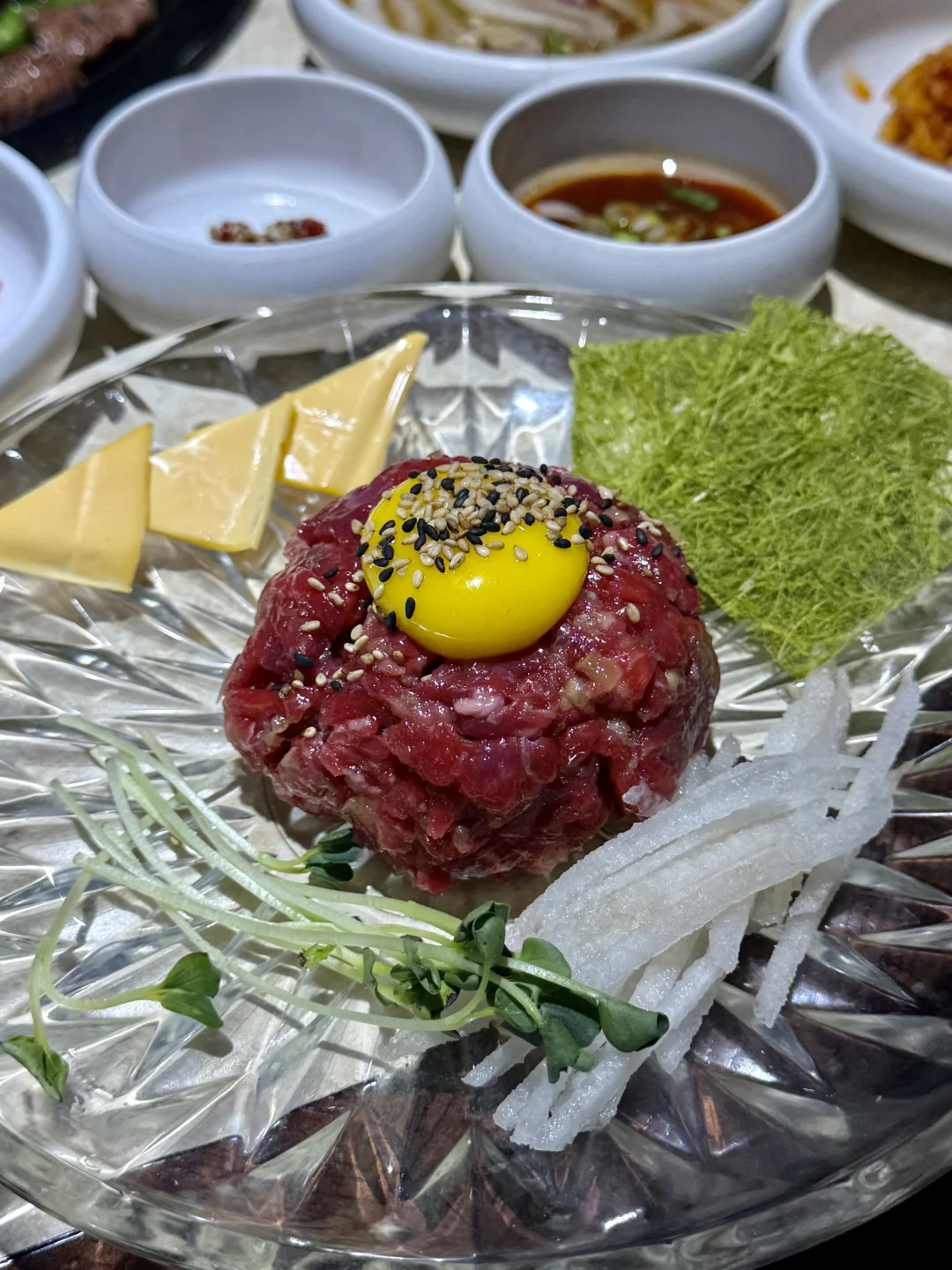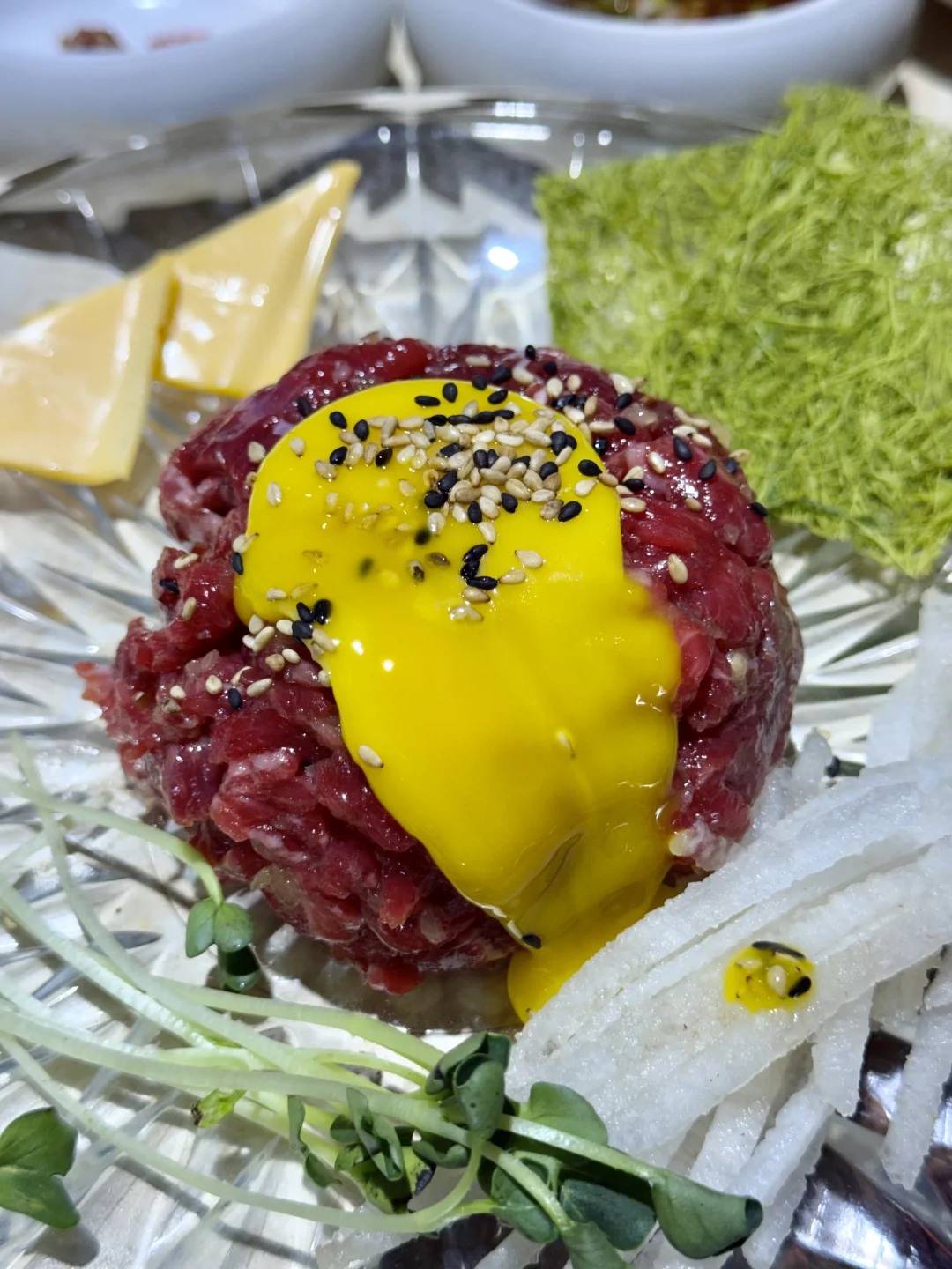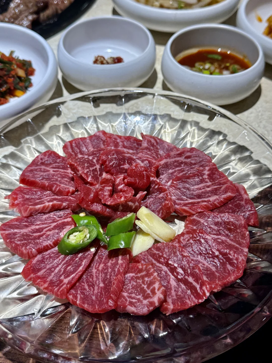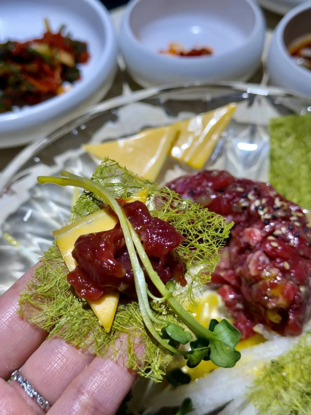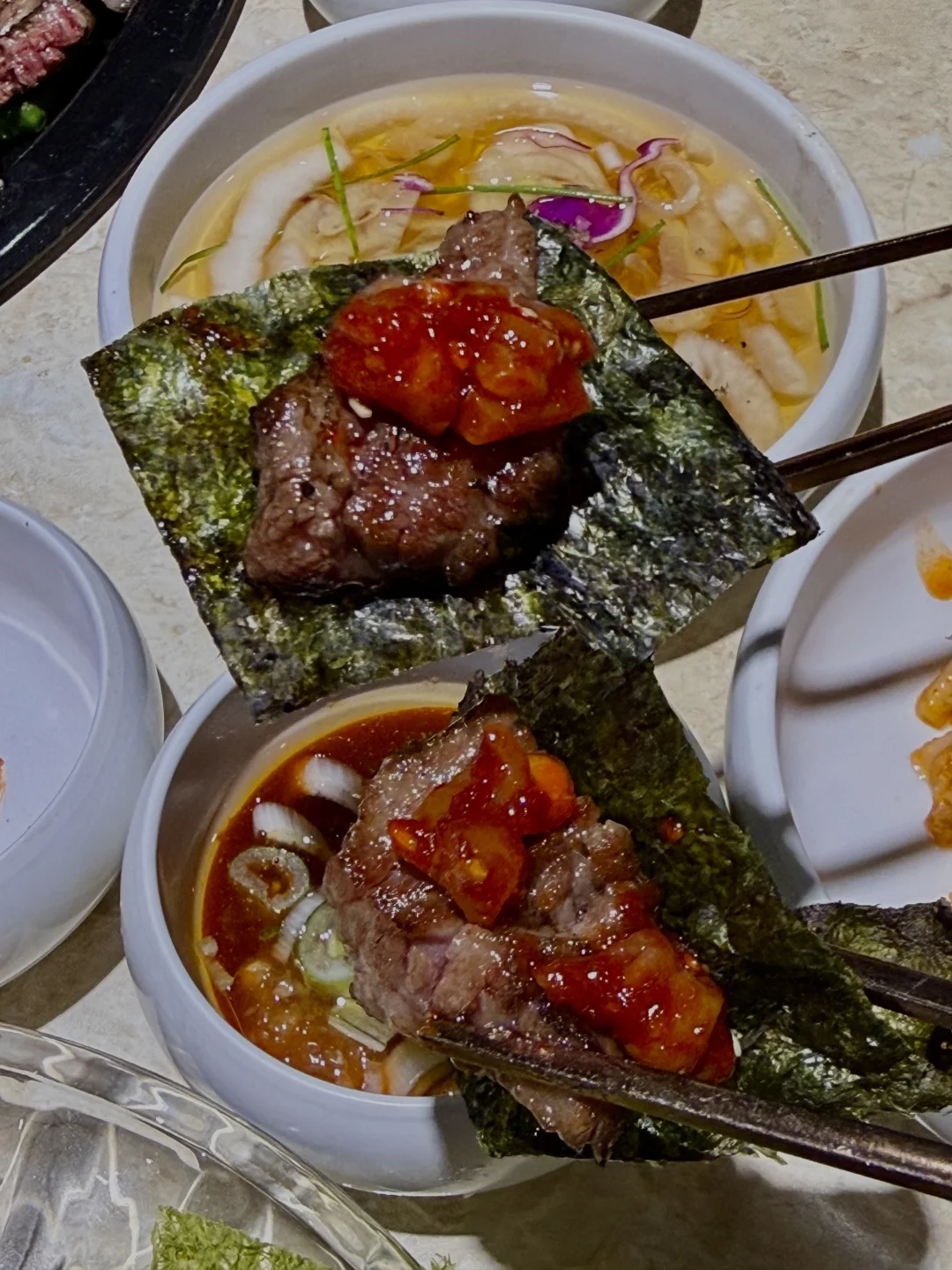 牛肉油脂非常的丰富,但是完全不腻,只要蘸少许盐🧂就好美味!还get了海苔➕牛肉➕泡菜的吃法!jue!