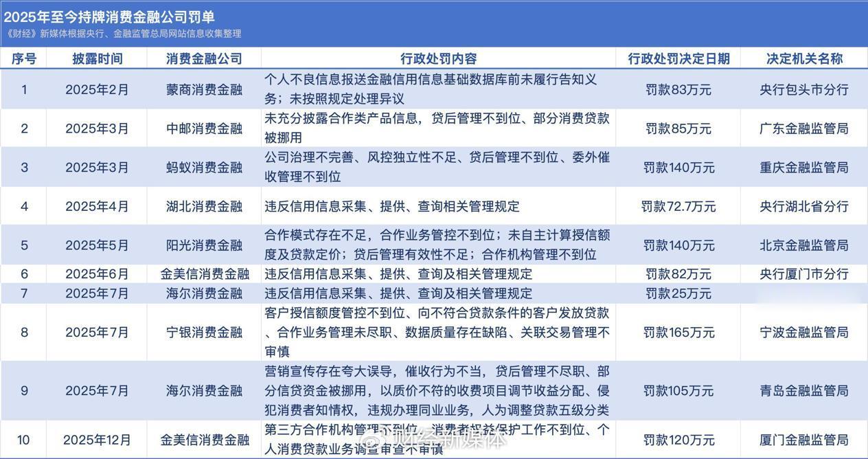 值得注意的是,包括海尔消费金融与金美信消费金融在内的多家机构,其罚单事由均直接关联消费者权益保护。
