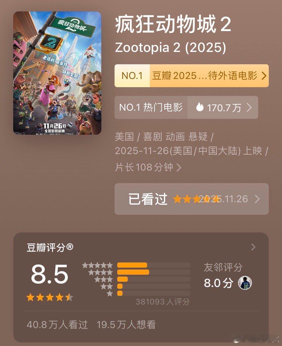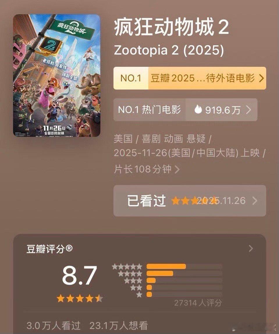 《疯狂动物城2》票房四连降,后劲乏力。后期走势不及预期,感觉和口碑下滑有关。豆瓣开分8.7分,目前8.5分。第一部200多万人打分,评分一直稳居在9.3的高位。上周六周日,《疯狂动物城2》单日票房表现疯狂,单日票房分别破了7亿和5亿。不过到了工作日,《疯狂动物城2》的单日票房就开始持续下降了。周一勉强破亿。周二7700多万。周三6800多万。周四5000多万。目前,《疯狂动物城2》票房已经达到了22亿,最终破30亿应该不难。但指定达不到40亿了。这和之前的预测票房相差的还是有点多啊。《疯狂动物城2》目前的豆瓣评分为8.5分,已经比开分时的8.7分少了0.2分。而第一部打分人数200多万,评分依旧稳定在9.3分。