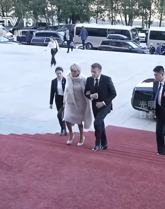 法国夫人围着米色围巾,光腿穿单鞋,为了美太拼了吧!12月4日马克龙夫妇抵达人民大会堂,布里吉特挽着总统老公的胳膊上台阶,夫人这身打扮诠释了什么叫做“美丽动人”! 今日份的北京天气并不暖和,然而法国夫人为了出席欢迎仪式,完美展示自己的身材与魅力,居然穿着裙装在室外,尽管外面穿着风衣围着保暖的围巾,但双腿露在外面,让人看着都冷呀! 看来总统夫人是真的抗冻,好在下车到人民大会堂的距离并不远,也就上个台阶就到了,因为到了室内暖和了。