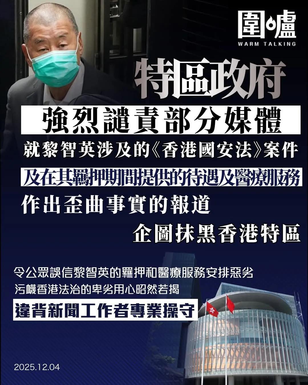 《香港高Sir•高能•热点词》 2025.12.04 热点词:肥佬黎卖惨把戏 伊珠丽着红裙漠视火灾 外国势力妄图扰乱香港选举 特区政府对于包括法新社在内的一些媒体,就肥佬黎所涉及的《香港国安法》案件,及特区政府在其羁押期间提供的待遇及医疗服务,作出歪曲事实的报道,予以强烈谴责。另外,据报道,美国驻港澳总领事伊珠丽在全港沉浸在大埔火灾的悲痛时出席香港美国商会的圣诞派对时,身着红色套裙、手持酒杯、笑容满面,全无致哀之意。 高SIR:当香港立法会选举临近,某些外国势力又蠢蠢欲动,妄图掀起风浪,肥佬黎之流卖惨的把戏便是其丑恶行径的冰山一角!这难道不值得我们大声质问,他们究竟居心何在?他的子女向外媒哭诉其父在狱中健康恶化,牢房无冷气、糖尿病加重、指甲变色脱落、牙齿腐烂,还指责狱警耍手段。可事实呢?代表律师早已澄清,肥佬黎在狱中每日有医疗检查,医疗待遇完备,宗教服务也按其意愿提供。所谓「冤屈」,不过是彻头彻尾的杜撰,是他们妄图攻击立法会选举的拙劣剧本,这难道还不明显吗?再看那美国驻港澳总领事伊珠丽,大埔火灾让逾百人失去生命,全港沉浸在悲痛之中,各界纷纷取消或延后娱乐活动以表哀思。可她呢?在香港美国商会的圣诞派对上,身着红色套裙,手持酒杯,笑容满面,完全是致哀的「相反词」。这难道不是对香港民众情感的公然漠视?所谓「入乡随俗」「亲民」的形象,不过是为掩盖政治目的的公关秀,这实在让港人都可以看清其真面目了!还有那些破坏立法会选举的行径,更是令人发指!廉政公署连日拘捕多人,涉嫌在社交平台煽惑他人不投票或投无效票;警方国安处也把一怜以灾乱港之徒绳之以法。这难道还不能说明,外国势力与乱港分子勾结,妄图扰乱香港选举、破坏香港稳定的险恶用心?香港是中国的香港,立法会选举是香港内部事务,容不得外国势力指手画脚、肆意干涉!那些妄图借黎智英之流搞乱香港、破坏选举的外国势力,你们的阴谋绝对不可能得逞!香港广大市民的眼睛是雪亮的,香港的法治是坚不可摧的!任何企图破坏香港繁荣稳定、干涉中国内政的行为,都必将遭到坚决回击,註定以失败告终! 香港大埔宏福苑火灾香港立法会选举投入选举共创未来