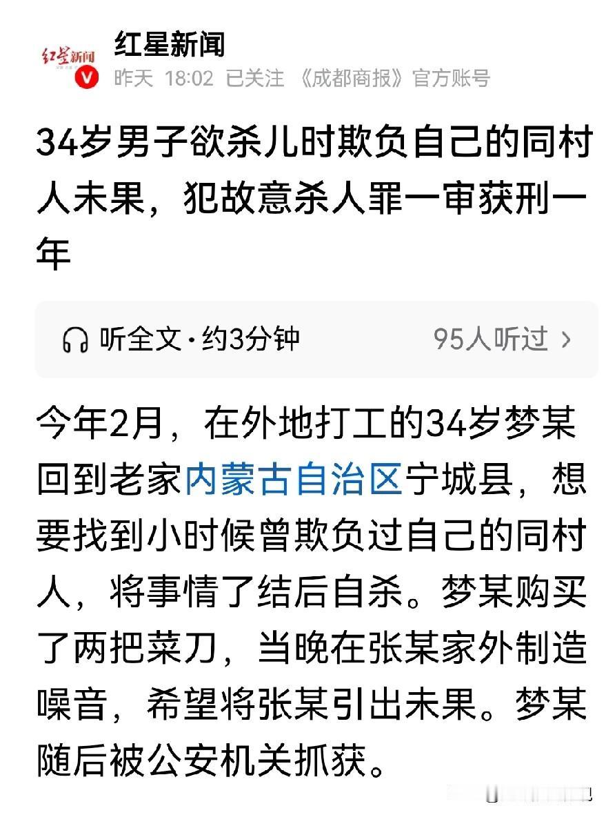内蒙古宁城,男子一直在外打工,34岁时回到老家村里,找到小时候曾欺负过自己的小伙伴了结。因人家不承认欺负过他,两人发生激烈争吵后,男子起了杀心。他买了两把菜刀,当晚9点,手持铁锤、菜刀、塑料桶、软管等工具,来对方家门口,想从车内抽取汽油后点燃汽车制造声响,引出对方和家人后,将其杀害。结果汽油没抽出来,男子将两辆车一通打砸,并在门口蹲守了一夜。警方介入后,男子被抓,而结局,令人意想不到! 梦某小时候生活在老家村里,在他的记忆里,有个小伙伴张某,曾欺负过他。 梦某觉得,当年自己弱小好欺,又没人撑腰。但他心胸狭窄,便将此事一直记在了心里。 也许当年那都是小孩子们无心的玩闹,梦某却一直认为是被欺负了,并此事耿耿于怀。 成年后,梦某就去了外地打工,但他常常想,一定要报复当年欺负过自己的张某。 而当年一起玩耍过的小伙伴张某,早就把玩闹的事忘了。 今年的2月,已经34岁的梦某,从外地打工的地方回到了老家村里。 同时复仇的种子在他的心里发芽,又像雨后的野草一样疯长。 很快,那股怒火烧得梦某失去了理智。 他这次回来,就是想要找到小时候欺负过自己的同村人张某,想要把事情做个了结。 但他也很清楚,真要犯了法,自己也会受到法律的制裁。 所以从一开始,他就做好了心理准备,在和张某了断后,自己也不活了。 2月5日,梦某做了准备,他买了两把菜刀,找到张某家里理论,指责他小时候曾欺负过自己。 张某都被问都蒙了,他无论如何也想不起来啥时候欺负过人。 梦某本来就是带着怒气去了张家,两人一言不合,就发生了激烈的争吵。 这更激起了梦某的怒火,他产生了杀害张某的念头。 就在当晚9点,梦某手持锤子、菜刀、塑料桶、软管等工具,来到张某家的门口蹲守。 当时,张某家有两辆车停在门口外。 梦某打算用软管将车里的汽油抽出来,再将汽车点燃。 等张家的人发现情况后,开门出来,他用早就准备好的菜刀,将张某及其家人杀害。 他先是用锤子,将两辆车的油箱盖砸坏,将软管伸进油箱,想抽取里面的汽油。 但他捣鼓了半天,一点儿油也没抽出来。 一气之下,他用锤子将车窗玻璃、和倒车镜全部砸坏,故意制造出声响,想将张家人引出来。 然而,不管梦某在外面怎么折腾,当晚张家却没有一点动静,始终没有人理会他。 梦某从晚上9点,一直蹲守到第二天早上6点,因怕天亮后被人发现才离去。 张某和家人,因为闭门不出,总算躲过了一劫。 第二天一大早,张某发现车辆被砸,损坏严重,马上报了警,梦某很快被警方抓获归案。 人们不能理解梦某的行为,作为正常人,谁会为小时候的某件往事,几十年还放不下,非要报复对方不可? 警方对梦某做了司法鉴定,结果显示,其在案发时很正常,有完全刑事责任能力。 梦某被公诉机关指控为:预故意剥夺他人生命,情节较轻,但其行为已构成故意杀人罪。 公诉机关对梦某指控的犯罪事实,及罪名成立,被法院予以采纳 梦某在被抓后,并没有供认自己的意意图。 他辩称,自己当时没有想杀害人,而是去偷汽油了,后来突然发现有监控,又用锤子砸了车。 法院庭审查明后,对梦某的辩解,不予采纳。 事后,梦某的家属积极的赔偿了张某家的车辆损失,张某也表示了谅解。 一审法院认为,梦某为了实施犯罪,精心准备了工具,并制造条件。 因没有对被害人的生命造成危险,属于犯罪预备,可以比照既遂犯减轻处罚。 梦某到案后,能如实供述部分犯罪事实,可酌情从轻处罚。 根据《刑法》第232条:“故意杀人的,处死刑、无期徒刑或者10年以上有期徒刑;情节较轻的,处3年以下有期徒刑、拘役或者管制。” 梦某因儿时被欺负的经历怀恨在心,成年后,返回老家欲报复张某。 他购买菜刀等工具,并前往张某家门前,试图通过点燃车辆,引出张某及其家人进而实施杀害行为。 其主观上具有非法剥夺他人生命的故意,客观上实施了为杀人准备工具和制造条件的行为,符合故意杀人罪的构成要件。 《刑法》第22条第2款:“对于预备犯,可以比照既遂犯从轻、减轻处罚或者免除处罚。” 最终由于梦某未抽取出汽油,未对张某,及其家人的生命,造成现实紧迫危险,属于犯罪预备阶段。 根据上述法律条款规定,可比照既遂犯减轻处罚。 同时,梦某到案后,如实供述部分犯罪事实,且家属积极赔偿了张某家车辆损失获得谅解。 法院综合考虑这些因素,依据相关法律条款,对梦某合理的处罚。 体现了法律对犯罪行为的惩处,以及对犯罪预备、坦白、谅解等情节的考量。 最终,一审法院以犯故意杀人罪,判处梦某有期徒刑一年。 此事提醒众人,一定要做个善良人,不要随便欺负弱小,以免被人惦记,而生活的不踏实。 同时我们做人也应心胸宽广,要拿得起,放得下,才能生活的轻松自在。 对此你怎么看? 冬日生活打卡季 关注@赵哥的法律观,明辨辨是非不上当。