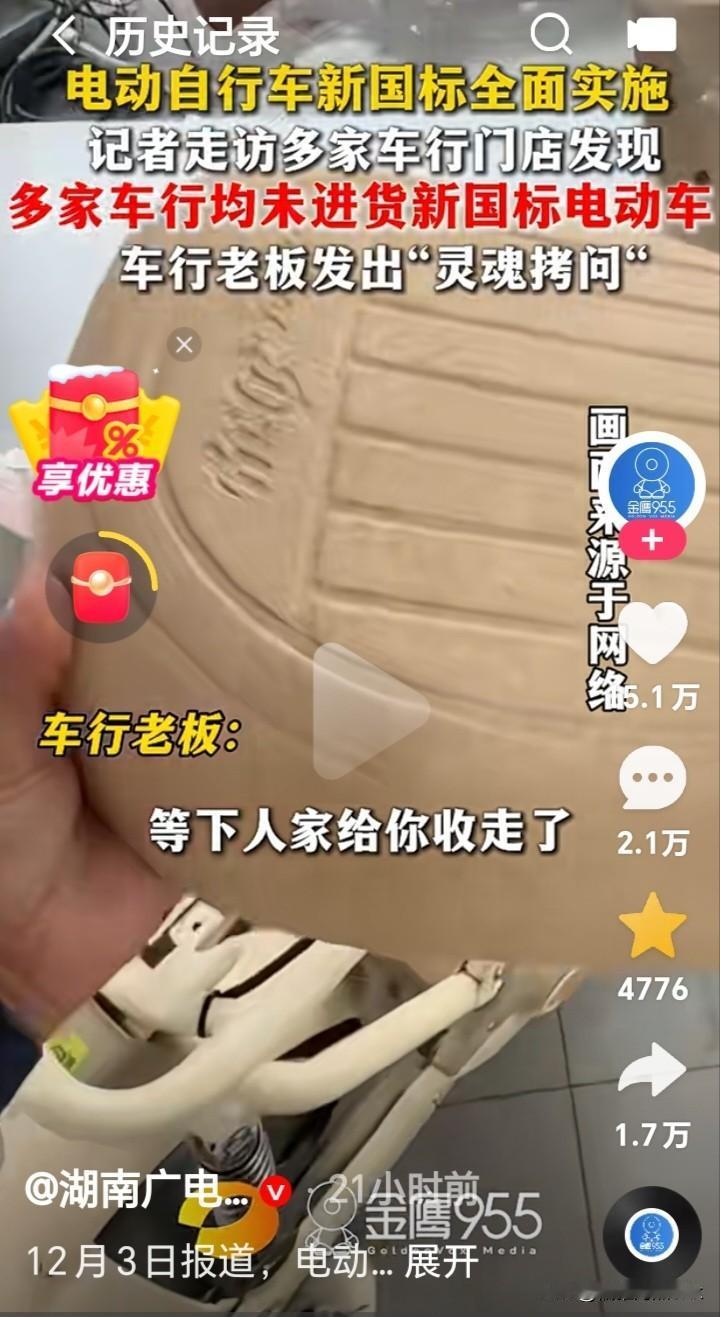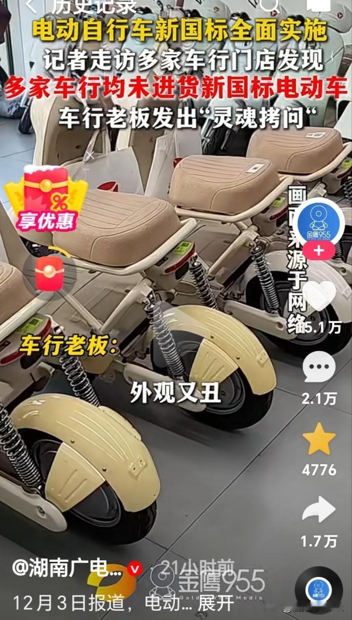 新国标电动自行车被骂上热搜,车行老板都不肯进货,声称,狗看了都摇头。 新国标电动自行车全面实施,记者走访了多家车行,老板们直摇头,声称不想进,价格又贵,功能又少又不实用,外观又丑,速度又慢,最奇葩的是,坐垫可以随手取下,人走还得将坐垫拿走保管,否则容易被偷或者收废品的拿走了。 老板叹口气说,谁愿意买这样的电动自行车?狗看了都又摇头。 买电动自行车图的就是个方便实用,买买菜,接送孩子,但这款电动车,连这基本的实用性都剥夺了。前面没车篓,后面没座椅,还得担心座垫被偷。 我都怀疑要么是成心为难人,助推家家买小汽车,要么是不食人间烟火的家伙设计的。 新国标无人问津,老板也苦恼。 国家鼓励多生孩子,买不起汽车,怎么接送孩子?上下班顺便买点菜没地放,下雨的雨衣搁哪? 对!还不如买二八大杠自行车,价格只要电动车的零头,既能带孩子,带菜,又能锻炼身体。 自行车行做梦也没想到,新国标电动车将路走死了,轮到了自行车再创辉煌。 我担心,会不会等大家都买了自行车,立马又搞个自行车新国标,让自行车也骑不了。