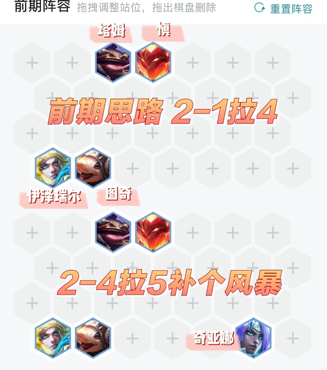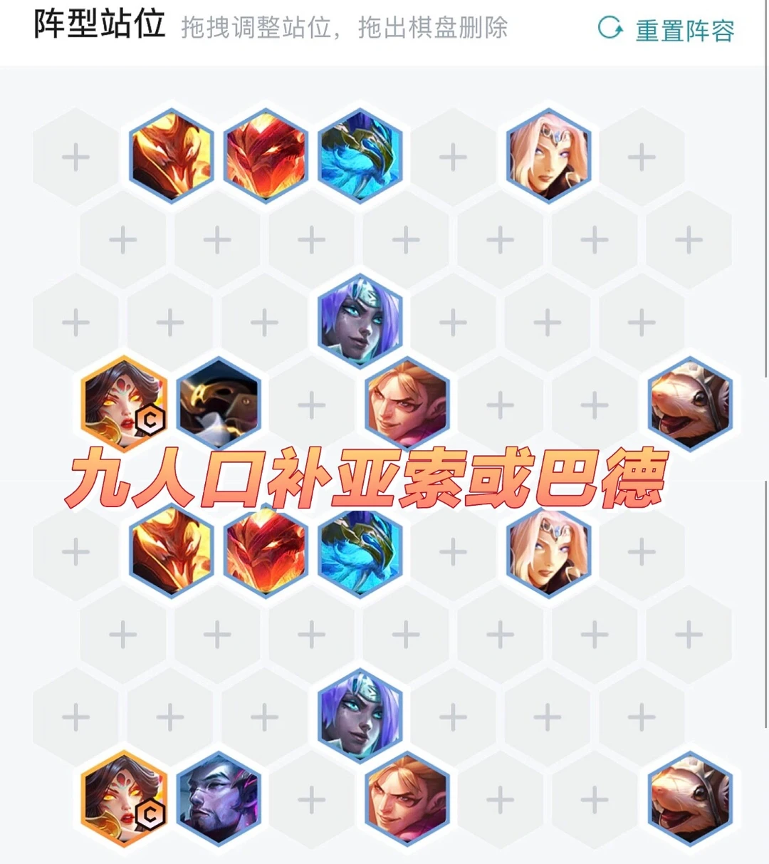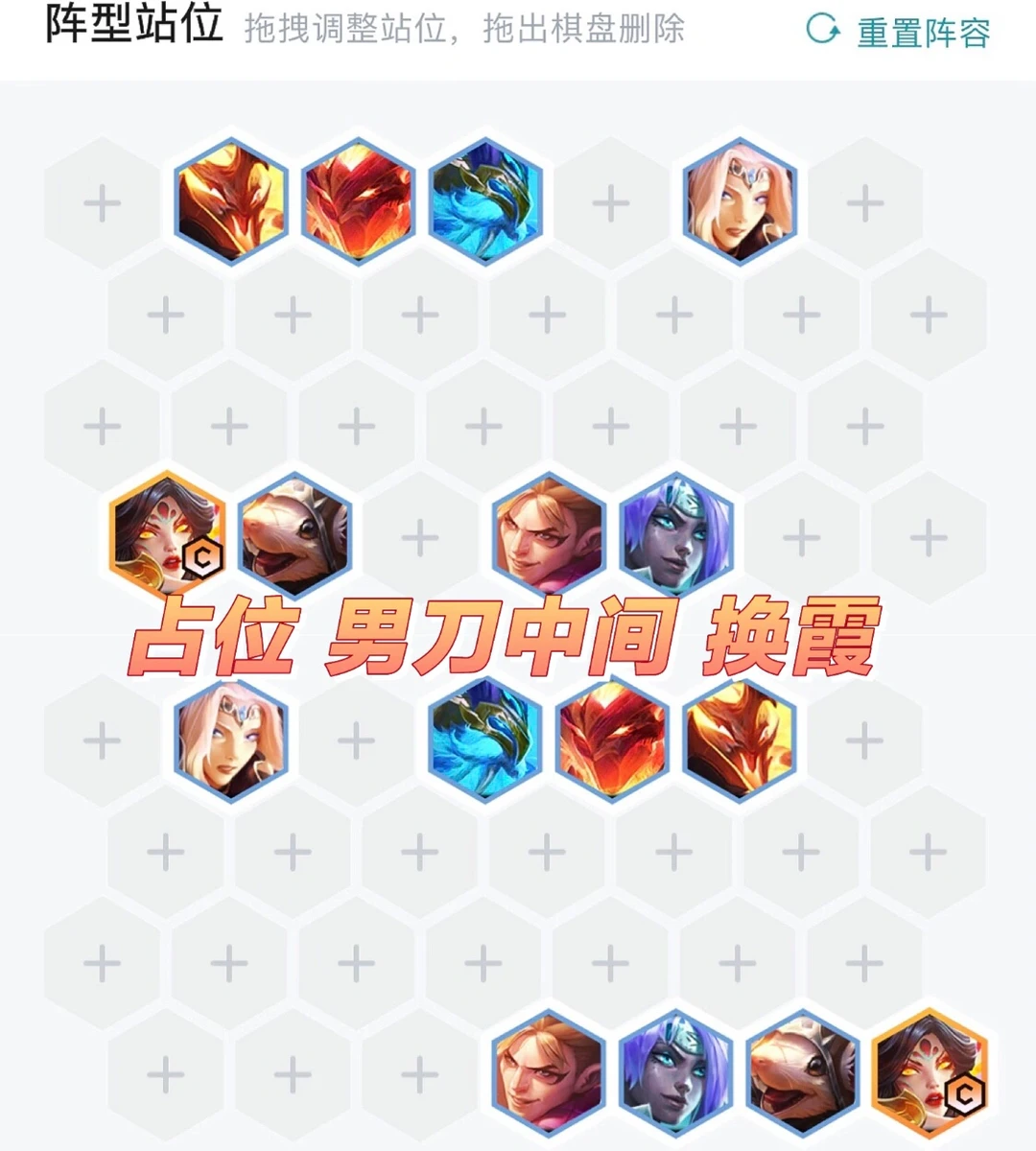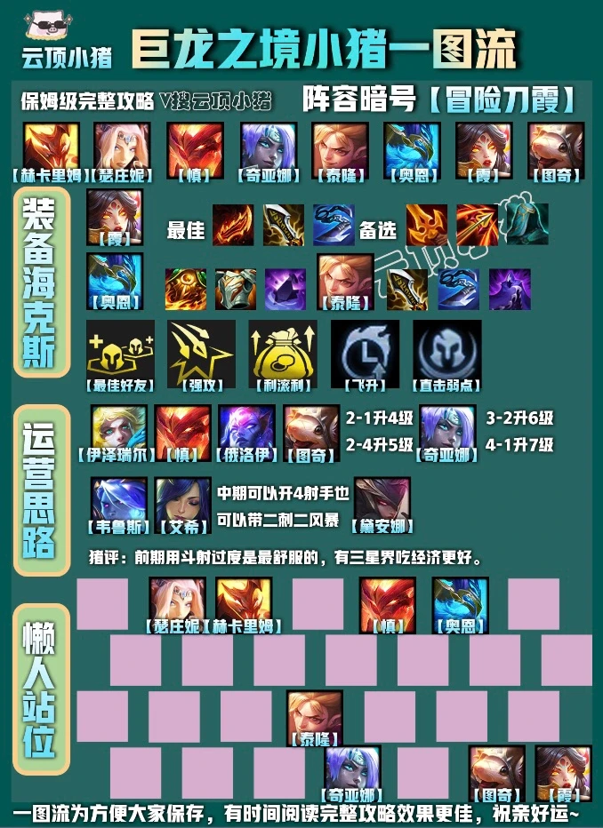 这套阵容霞主C,男刀做副C。后期如果打刺客需要全部缩角站位,4、5阶段全二星基本无敌,血量低就7级抽牌,全部一星再上8也很容易吃分。