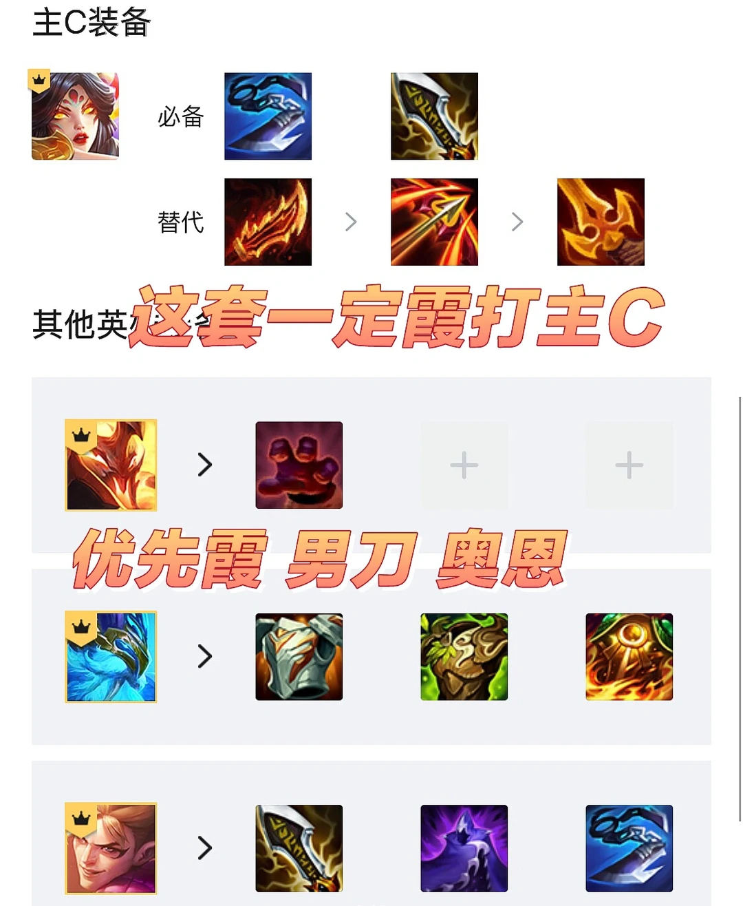 这套霞是主C,国服第一的理解直接抄下来就行。男刀并不稳定,拿来补伤害收割打AOE更合理。其次肉装给到奥恩最佳,人马的大招不如奥恩,坦度也偏低。