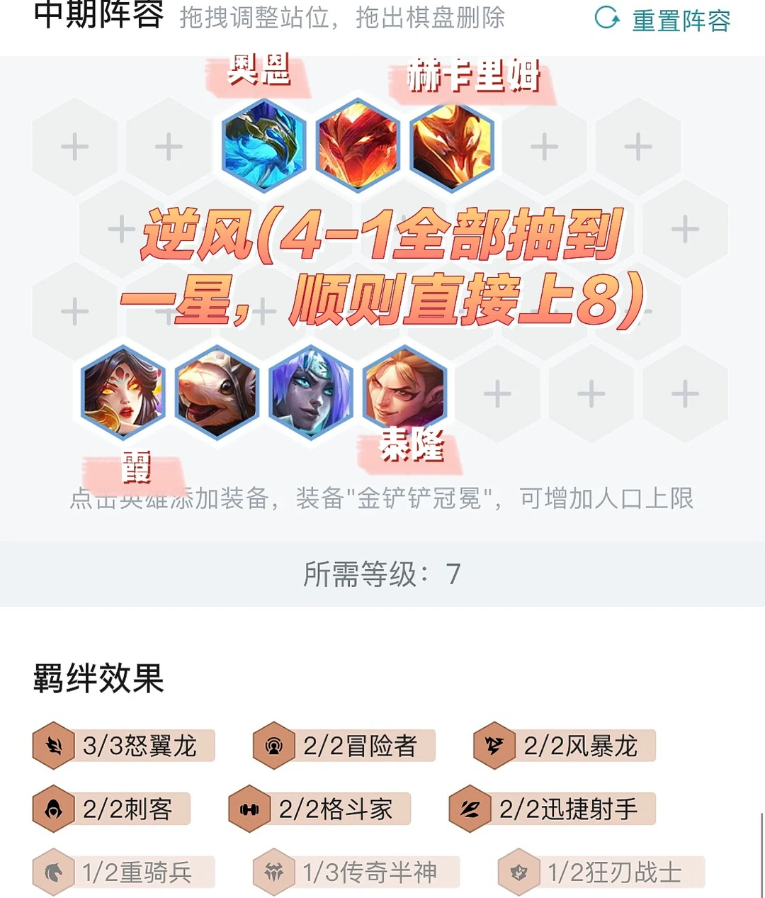 逆风级7人口开始搜牌,节奏比较慢(钻石段位一下)奔着上8搜牌更好,八人口全二即可锁血上九,除了刺客基本不怕任何阵容。