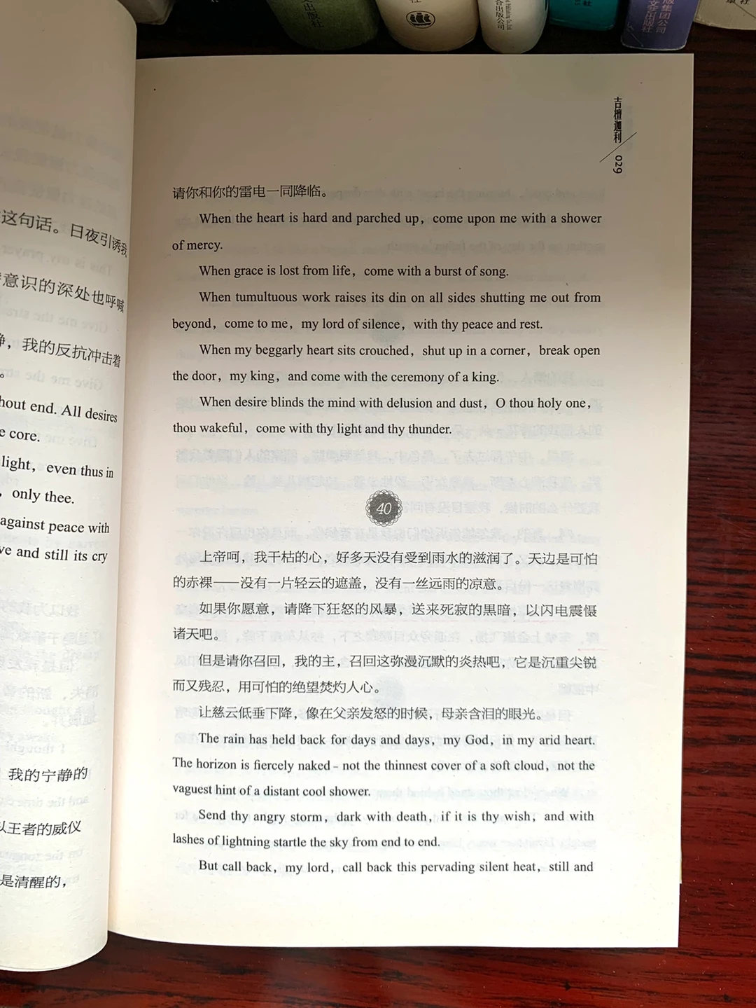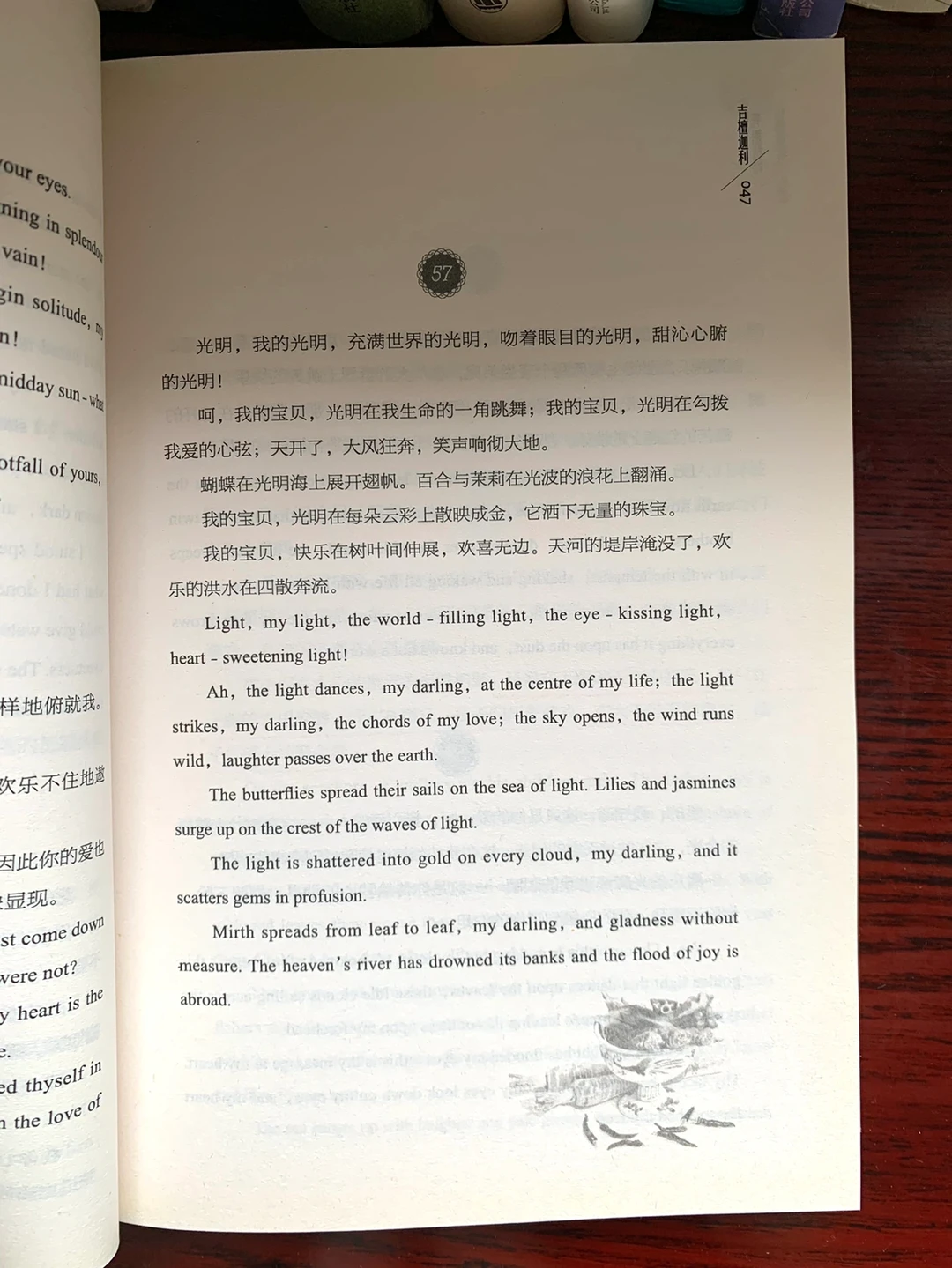 《吉檀迦利》这部宗教抒情诗集,是一份“奉献给神的祭品”。《飞鸟集》里诗人以抒情的彩笔,写下了他对自然、宇宙和人生的哲理思索。《园丁集》是一部“生命之歌”,它更多地融入了诗人青春时代的体验,可以视为一部青春恋歌。《采果集》中阐述了他的世界观、人生观、进化论、宗教观点、哲学思想和艺术观,表达了他的志向抱负。《新月集》诗人将自己的灵魂穿织于诗章词篇里,使诗句充满了灵性的芬芳。