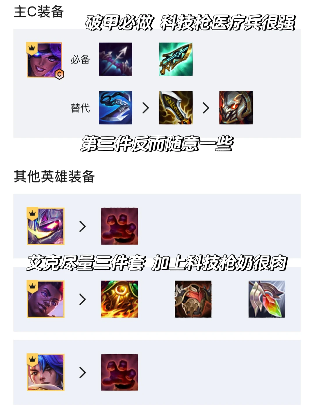 [氛围感R]装备思路:莎弥拉的轻语非常关键,全体破甲对于枪手收益巨大,第二件是科技枪,不仅自己能回血,而且能够一直给前排艾克牛头这些奶血非常变态,第三件而且随意一些。