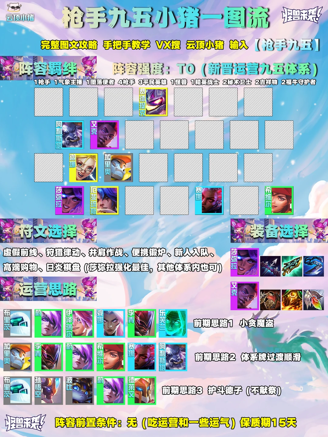想要上大分,还是要奔着登顶去[偷笑R]上个版本的答案精英九五现在已经非常难了,最近小猪又在目前云顶国服第一F神那里偷了一套枪手九五的理解。