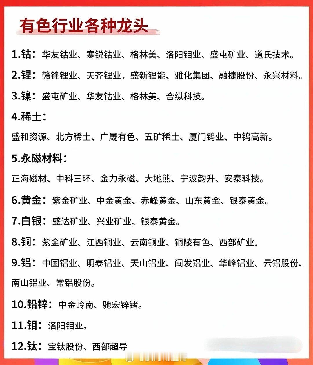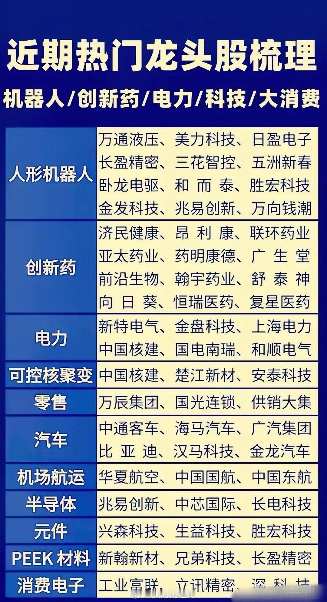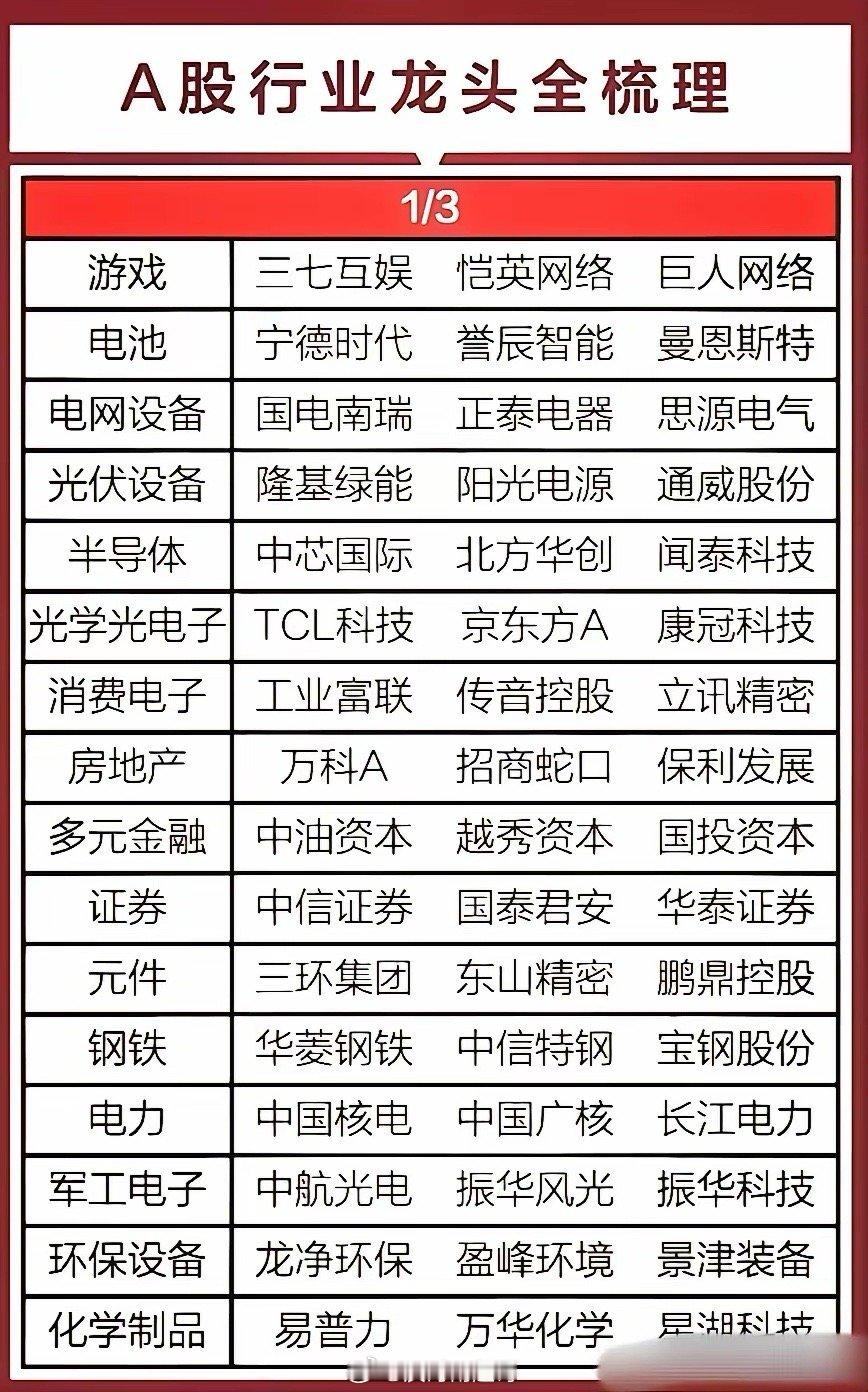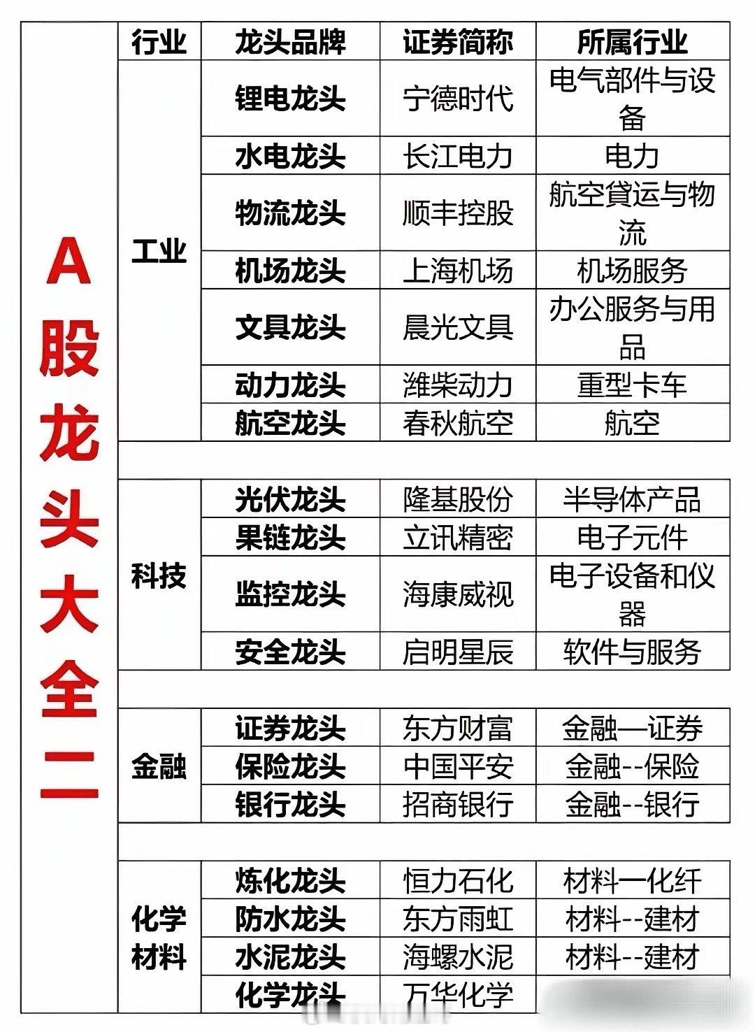 买股票就是买公司,价值投资本应如此!买公司是选择公司未来折现的能力,各龙头股稳定的折现能力是很好的选择:1、北方稀土:稀土永磁龙头2、中际旭创:光模块龙头3、药明康德:医药龙头4、先导智能:固态电池龙头5、工业富联:苹果手机代工龙头6、卧龙电驱:机器人龙头7、中芯国际:国产芯片晶圆代工龙头8、动力电池:宁德时代9、寒武纪:AI算力龙头10、中国平安:保险公司龙头11、科大讯飞:智能语音龙头12、中兴通讯:5G/6G通信龙头13、海光信息:高端处理器龙头14、整车制造:比亚迪15、兆易创新:存储芯片龙头16、工商银行:银行龙头17、东方财富:证券公司龙头18、中国移动:通信企业龙头19、长城军工:国防军工龙头20、中国卫星:航天科技龙头21、紫金矿业:贵金属产储量龙头22、浪潮信息:AI服务器算力龙头23、胜宏科技:特斯拉服务商24、立讯精密:消费电子制造龙头25、阳光电源:绿色储能龙头26、中国电影:影视制作龙头27、中国船舶:船舶制造龙头28、美的集团:家电龙头29、亿纬锂能:光伏储能龙头30、广生堂:创新药龙头31、长江电力:电力龙头32、中国核建:可控核聚变龙头