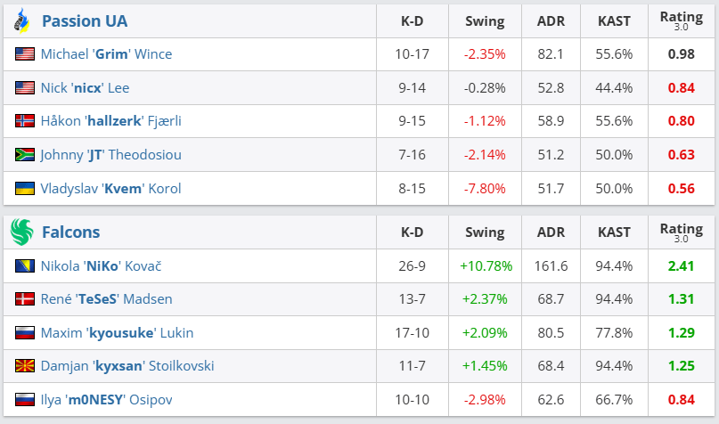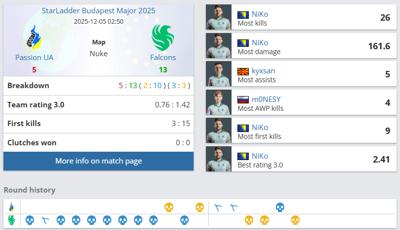 虎扑12月05日讯布达佩斯Major第三阶段瑞士轮0-1组,Falcons对阵PUA选图Nuke比赛结束,Falcons13-5PUA,数值碾压,Falcons轻取PUA。首日一胜一负,Falcons进入1-1组。
