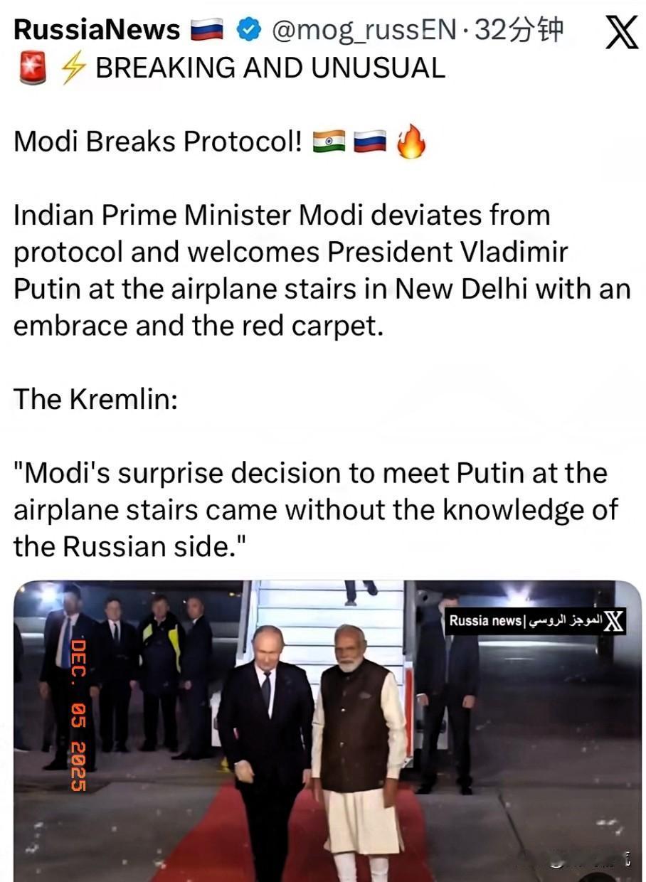 克里姆林宫表示印度这次让他们比较意外! 印度总理莫迪这次完全就是打破了常规,亲自在新德里机场的飞机舷梯上迎接普京并且拥抱,铺设红毯的高规格礼遇更是拉满。克里姆林宫直言,莫迪这一出人意料的决定,俄方事先毫不知情,这份热情超出了所有预期。 这背后我认为其实是现实利益的硬绑定,美印之间的摩擦不断升级是关键推手。特朗普第二任期以来,美国对印度征收的关税累计达50%,还撤销了恰巴哈尔港的制裁豁免,让印度西进战略遇阻。 而俄印合作早已密不可分,2024年俄罗斯向印度供应6.345亿桶石油,占其进口总量的36.4%,仅折扣就帮印度节省22亿美元,双边贸易额更是飙升至687亿美元。 莫迪的高调迎接,本质是对多元外交的强化,也是给俄印合作再上保险。此次访问期间,双方不仅敲定20亿美元核动力潜艇租赁协议,还将推进S-400后续交付、苏-57联合研制,以及10年原油供应大单。 在西方制裁和大国博弈的背景下,印度用高规格姿态巩固俄印“特殊战略伙伴关系”,既为自己争取更多发展筹码,也帮俄罗斯打破外交封锁,这场双向奔赴早有必然逻辑。印度总理莫迪 印度选择俄罗斯 印度领导人 莫迪拉飞机