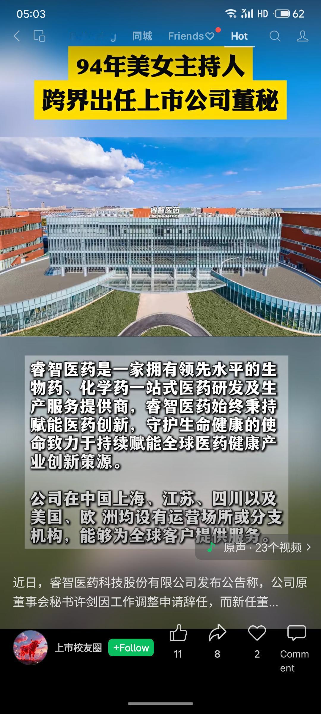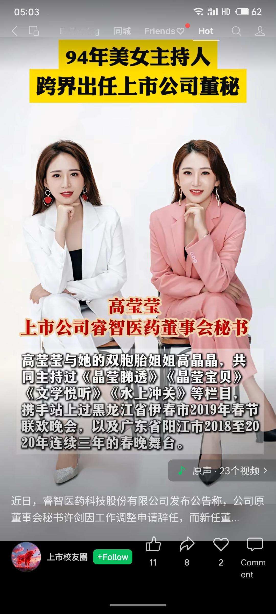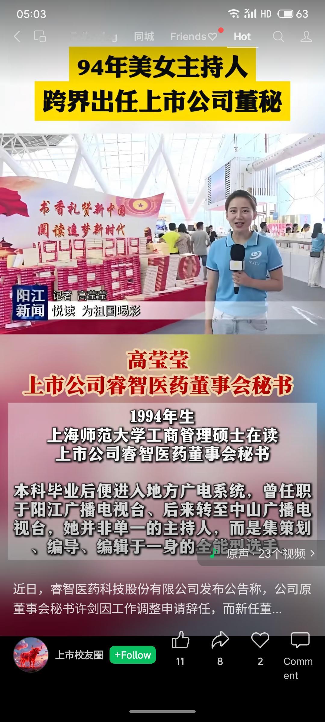 94年前主持人高莹莹跨界出任睿智医药董秘引发关注。其媒体经验丰富,且工商管理硕士
