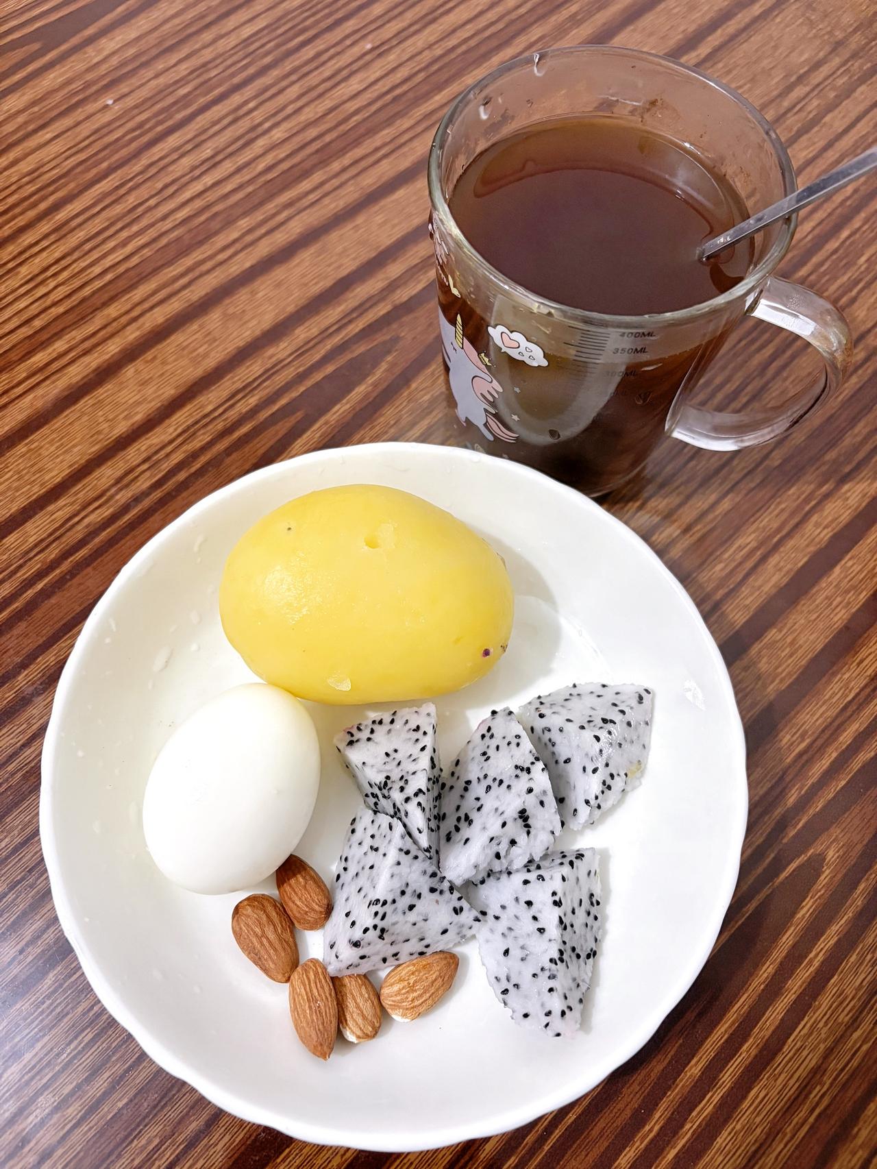 泪水打湿我的减脂餐,今日体重108.8斤⬇️0.6斤 今日减脂早餐:土豆+鸡蛋+干果+黑咖啡+火龙果 体重管理