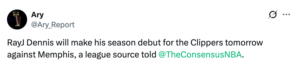 虎扑12月05日讯美媒Ary报道,一家联盟消息源透露,快船最新用双向合同签下的后卫雷杰-丹尼斯将在明天与灰熊比赛中迎来首秀。
