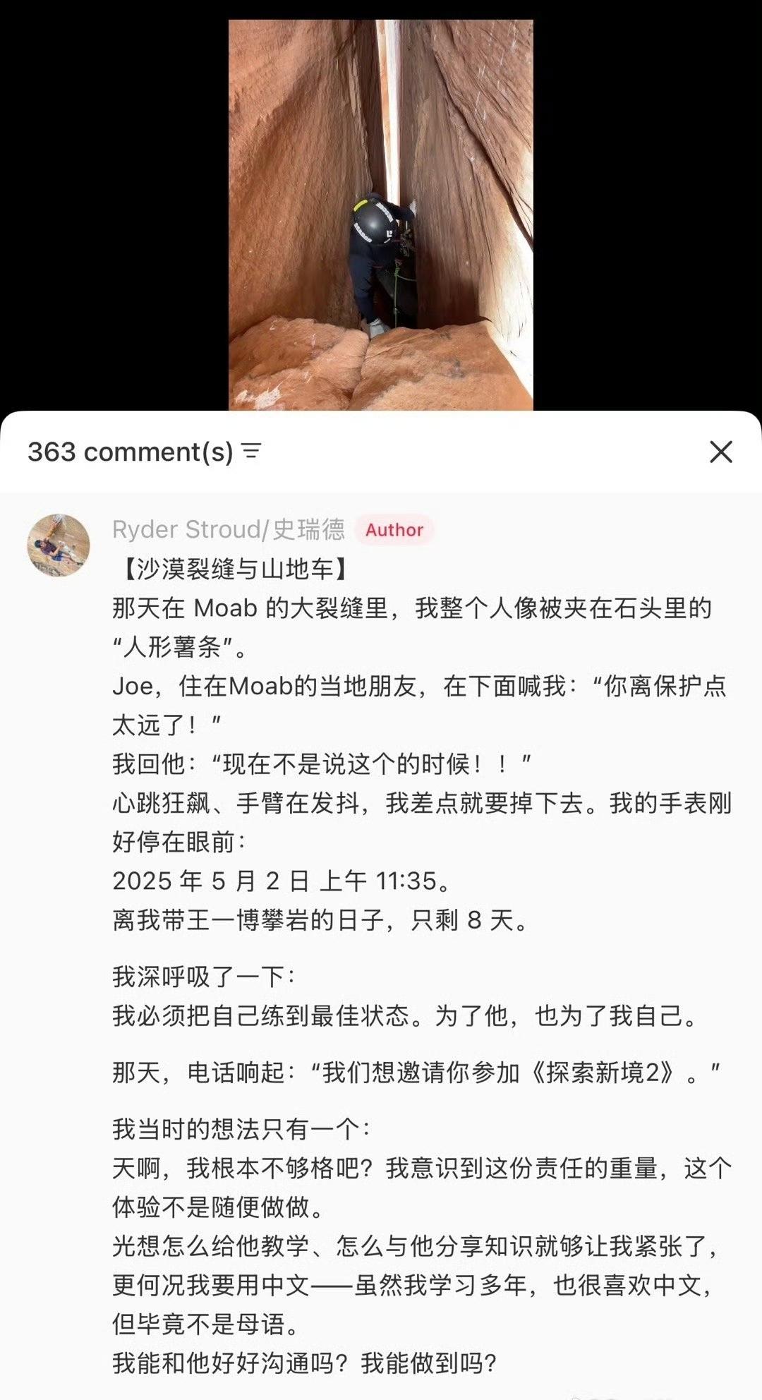 王一博在自己个人ip的户外探索纪实纪录片《探索新境2》中的攀岩搭档史瑞德分享了《