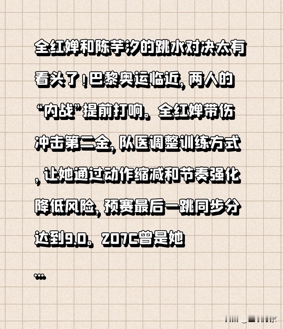 全红婵和陈芋汐的跳水对决太有看头了!巴黎奥运临近,两人的“内战”提前打响。全红婵带伤冲击第二金,队医调整训练方式,让她通过动作缩减和节奏强化降低风险,预赛最后一跳同步分达到9.0。207C曾是她的难关,今年测试赛却稳定性惊人。 陈芋汐则挑战升级动作407C,把难度从3.2升到3.4,赌“肌肉记忆+心理耐受”。她还曾在臂立动作精准度上苦练,将误差从3度缩到0.8度。这场比赛悬念十足,到底谁能笑到最后,太让人期待了! 全红婵 全红婵世锦赛 婵红婵 陈芋汐 全红婵 全红婵世锦赛 陈芋汐,全红婵 婵红婵 陈芋汐 全红婵走秀 全红全陈芋汐