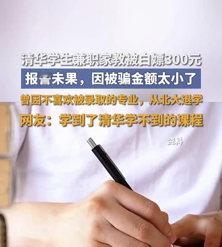 清华本硕家教被白嫖300元:家长消失的背后,是比钱更寒心的信任崩塌 清华本硕连读的高材生,放下身段给高三学生做家教,1个半小时只收300元,没想到课后要钱时,家长却直接“人间蒸发”。报警后因金额未达立案标准无果,这件事被当事人曝光后,瞬间戳中了无数打工人的痛点。 有人说“300元而已,清华学生何必计较”,但真正让网友愤怒的,从来不是钱的多少,而是付出劳动后被恶意拖欠的委屈,是真诚相待后被肆意辜负的寒心。这位清华学子本可以用这段时间泡在实验室、泡在图书馆,却选择用自己的知识助力高三学子冲刺,300元背后是知识的价值,更是一份愿意帮扶的善意。可家长的“消失术”,不仅否定了这份劳动,更践踏了人与人之间最基本的信任。 现实中,这样的“白嫖式”伤害并不少见:兼职文案写了三版方案被甲方无偿盗用,上门维修师傅忙活半天被说“没修好”拒付费用,外卖员冒雨送餐却被恶意差评扣钱。这些看似“小额”的不公,背后藏着的是对劳动者的不尊重,是把别人的善良当理所当然的自私。 更值得深思的是,这位家长或许忘了,他们的行为正在给孩子做最糟糕的示范。教孩子诚信做人,远比多考几分更重要。而那位清华学子的做法,却尽显体面:没有恶语相向,只是理性曝光维权,这份克制反而更让人共情。 300元或许很快就能挣回来,但被消耗的信任,却需要无数人用真诚去修复。希望这位家长能主动站出来结清报酬,也希望所有劳动者的付出都能被尊重。你是否也有过被“白嫖”的经历?欢迎在评论区分享你的故事,说说你是如何维权的~大学生做家教容易做吗? 大学生做家政,真的不值得吗?