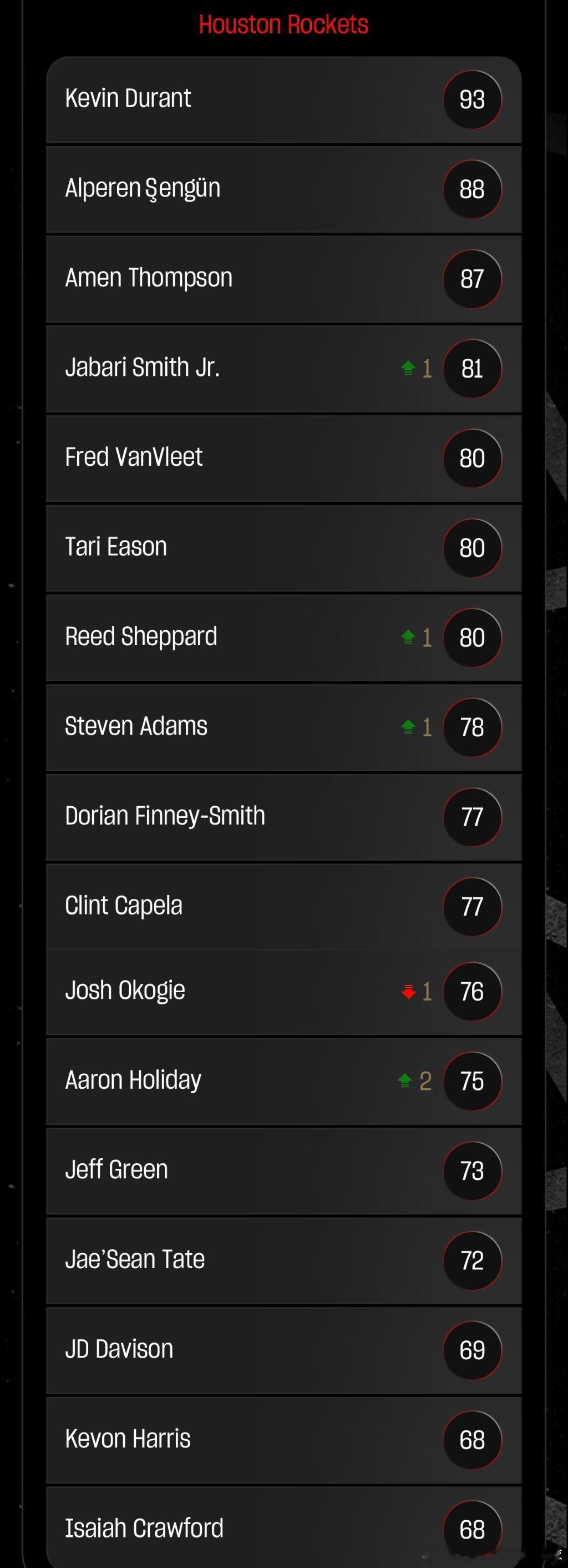 NBA2K官方更新了火箭各球员能力值列📊1. 凯文·杜兰特 - 932. 阿尔佩伦·申京 - 883. 阿门·汤普森 - 874. 小贾巴里·史密斯 - ↑1 📈815. 弗雷德·范弗利特 - 806. 塔里·伊森 - 807. 里德·谢泼德 - ↑1 📈808. 史蒂文·亚当斯 - ↑1 📈789. 多里安·芬尼-史密斯 - 7710. 克林特·卡佩拉 - 7711. 约什·奥科吉 - ↓1📉 7612. 阿隆·霍乐迪 - ↑2📈 7513. 杰夫·格林 - 7314. 杰肖恩·泰特 - 7215. JD·戴维森 - 6916. 凯文·哈里斯 - 6817. 以赛亚·克劳福德 - 68休斯顿火箭nba常规赛休斯顿火箭