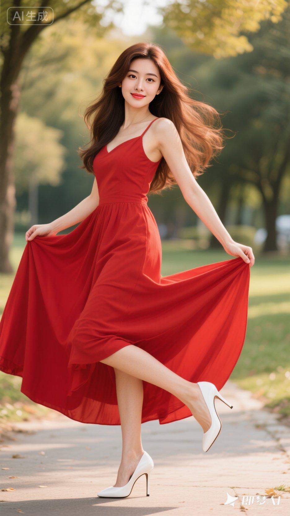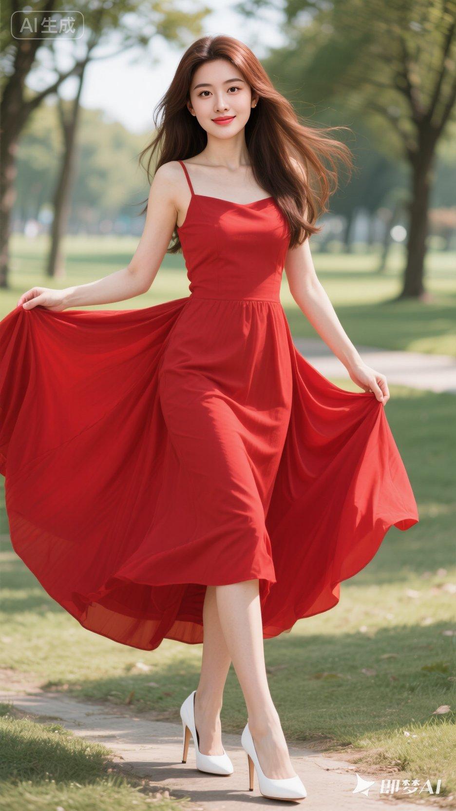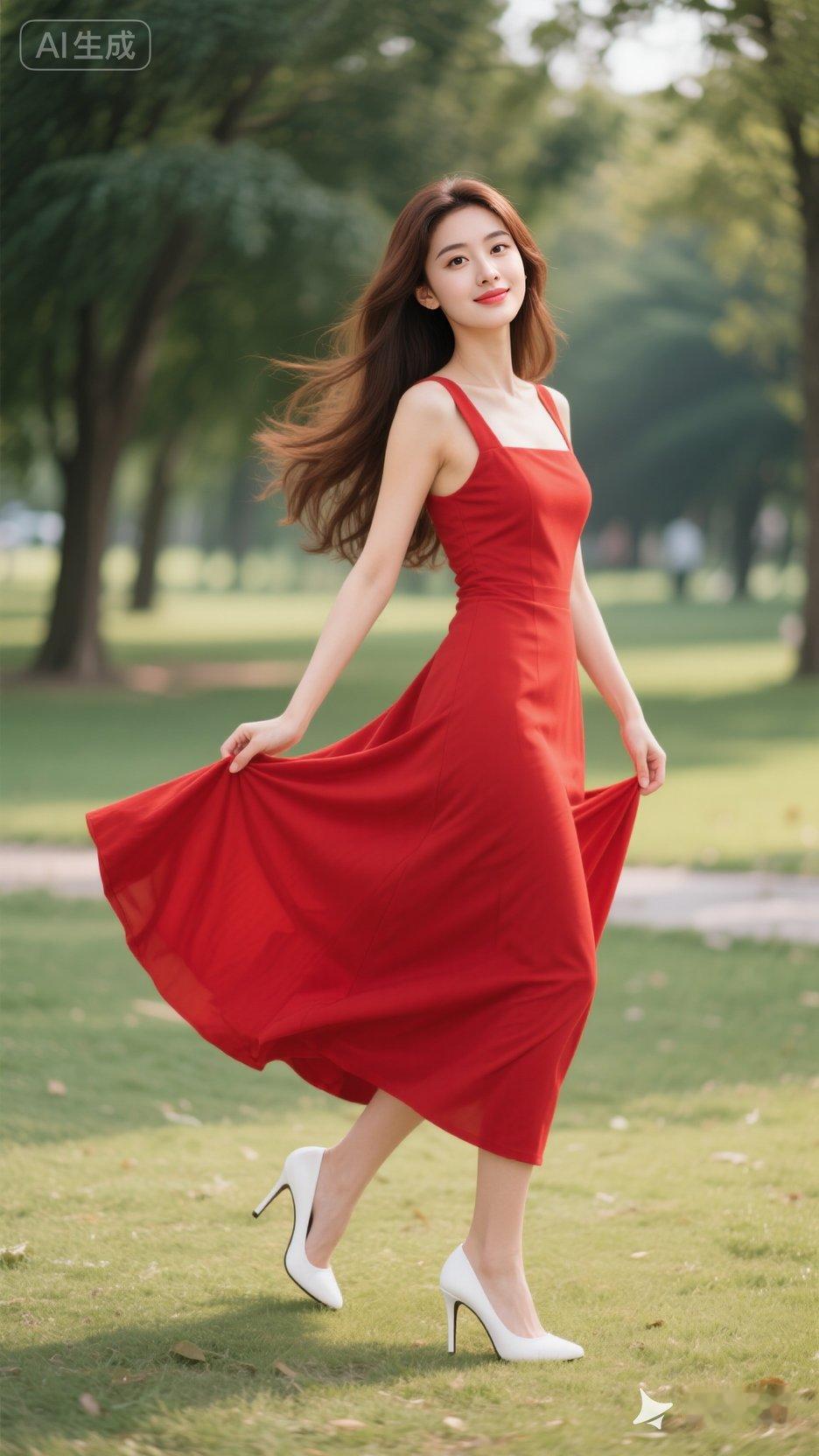 夏日红裙飘逸,公园漫步的优雅时光