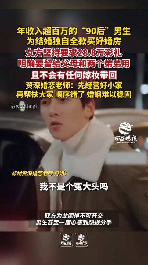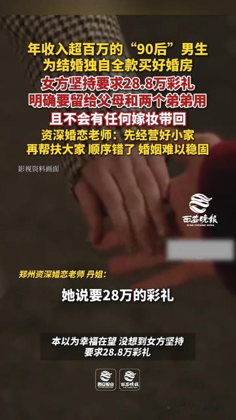 “离了个大谱!”近日,河南郑州,一年薪百万的男子为了结婚,全款购买了婚房,可女友因有2个弟弟要“照顾”,坚决索要28.8万元的彩礼,并且表示这钱就是给弟弟和父母用的,也不会带回任何嫁妆!网友:演都不演了? 结婚是每个人一辈子的大事,但结婚也需要大量的金钱支持,买房、买车、办酒席,全都是一大笔开销,而且还要给女方彩礼钱,而这份彩礼钱,也成为很多情侣闹分手的原因。 据媒体11月23日的报道,男子是一位非常优秀的年轻人,但由于之前一直忙于事业,所以并没有谈对象,虽然每年的收入超过百万,但是婚姻却成了大问题。 好在他成功谈到了一个情投意合的女友,为了彰显诚意,男子还全额购买了婚房,可就在二人商量具体事宜时,却因为彩礼的事闹得不可开交。 女友表示,自己的彩礼钱必须是28.8万元,少一分都不行,因为她还要替两个弟弟着想,不仅如此,家里也不会给任何嫁妆。 男子听后非常生气,不带嫁妆可以理解,28.8万元的彩礼自己也出得起,但是给两个弟弟用就太过分了,还没结婚就想着替弟弟分忧,那要是结了婚,不知道自己还要搭进去多少钱! 网友看后表示,这比那些“卖闺女”的父母还要夸张,直接挑明了告诉你,好像天经地义一样,对于这样的“扶弟魔”,建议尽早了断了吧,不然以后的日子有得受! 信息来源:《年收入超百万“90后”男生,为结婚独自全款买好婚房。女方坚持要求28.8万彩礼,明确留给父母和两个弟弟用,不会有任何嫁妆带回。双方为此闹得不可开交,男生甚至一度心寒到想提分手。》西安晚报