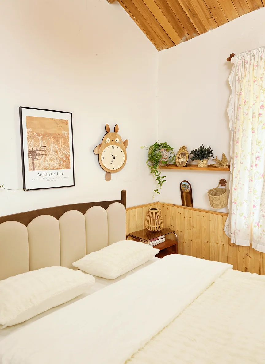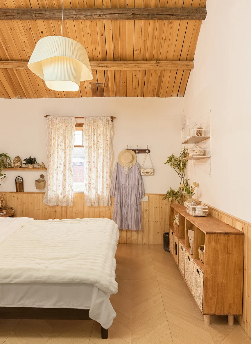 屋顶保留了原本老房的杉木屋面板,墙面自装桑拿板,既防潮护墙,又很有童话小屋的温馨感,