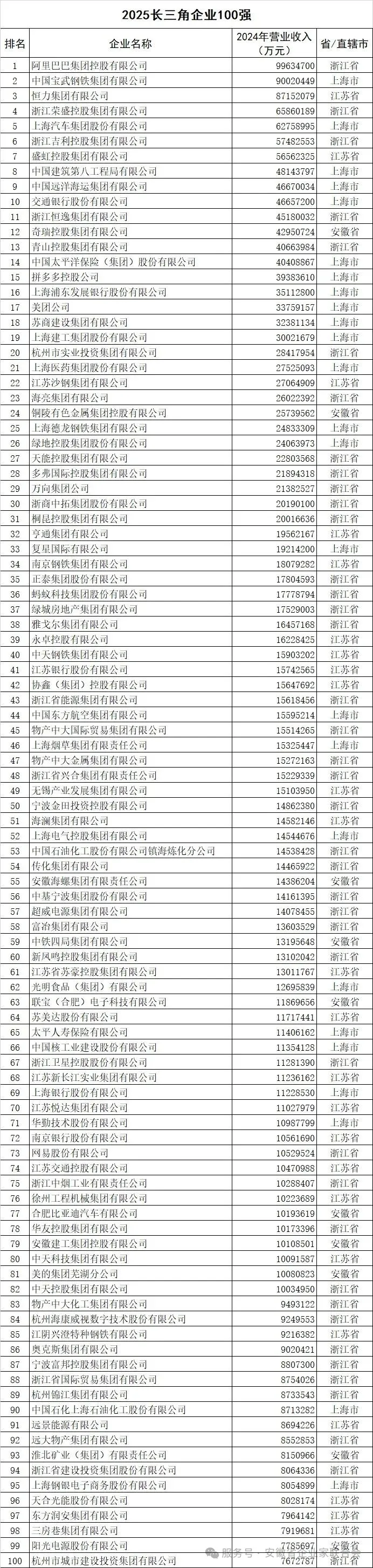 大皖新闻讯12月5日,长三角三省一市企联发布了2025长三角企业100强、2025长三角制造业企业100强、2025长三角服务业企业100强、2025长三角民营企业100强、2025长三角民营制造业企业100强、2025长三角民营服务业企业100强排行榜和2025长三角百强企业发展报告、2025长三角民营百强企业发展报告。安徽上榜企业表现亮眼,经营指标增速均明显高于长三角百强的平均值。