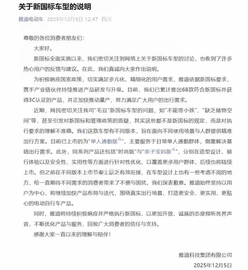 小电驴撞上了新国标,雅迪第一个站出来道歉了! 还真有人没估计错:不用多久,厂家肯定会出来回应:新车型为什么设计成这样?果然没猜错。 从9月开始新国标试运行到12月1日正式实施,都好几个月了,专业人士都没搞明白?偏偏在这个时候才发现问题吗,还是实在被吐槽无法再躲避呢。 从使用者的角度来说,不管你“单人骑”还是“亲子宝妈”款,没有个储存位置,坐包是铁的还随时可以取走,想消费者买账似乎很难。我看到我这边雅迪门店的新国标电动车,门店老板一脸无奈说,一台都没卖不出。(来源:观察者网) 一个企业它难道不知道什么产品才能畅销吗?车是代步工具,消费者除了方便便捷,更多的是使用功能。你到好,越做越简约,被骂是必然的。