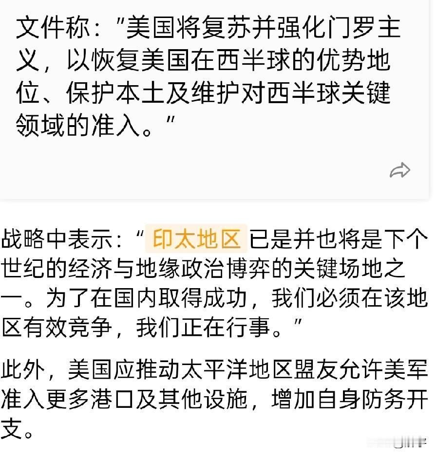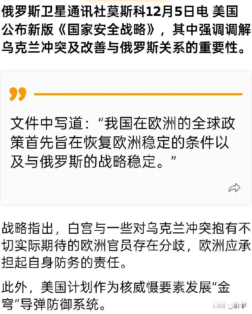 美国摊牌!俄罗斯独赢,亚洲成为其重点竞争地区! 刚刚,国际媒体报道了一个足以引导全球局势迅速产生变化的特大新闻,那就是美国公布新版《国家安全战略》。在这份特朗普主政下拟定的首份美国战略规划中,非常清晰的看到,俄罗斯将成为唯一一个赢家,欧洲将被美国疏远冷落,而亚洲却非常不幸地升级成为美国重点关注地区! 据该报道摘录内容显示,特朗普政府这份《国家安全战略》主要是恢复与俄罗斯的战略稳定、让欧洲自己承担防务、重点着力于亚洲竞争(具体内容见图三,图4)。由此可见,特朗普为什么会在近期致力于结束俄乌战争,甚至为了达成这个目标,不惜牺牲乌克兰的利益,置欧洲国家意见于不顾?这是因为特朗普政府的战略规划与广大网友们预测的高度一致,那就是美国要将主要力量集结亚洲,保持他们可以在这里获得优势地位。为此,为了不再重蹈拜登两面出击,全面失败的覆辙,美国不得不缓和与俄罗斯的关系,甚至于做出满足俄罗斯愿望的姿态来,以达到可以让俄罗斯在美国于亚洲大动干戈之际袖手旁观的目的,形成俄罗斯独赢之局面。特别值得警惕的是,美国要求日本、韩国大幅度提高军费一事已经得到两国应允配合,且湾湾也正在推动1.2万亿台币购买美国武器的方案,即将形成从东线到南线再到西线全面战备升级的紧张态势,目标已经呼之欲出。由此可见,伟人曾经的断言:“帝国主义亡我之心不死”仍未过时,我们不但要谨听伟人的相关教诲,还要学习伟人面对帝国主义挑衅时坚决反击之的做法,战而胜之,扬我国威!