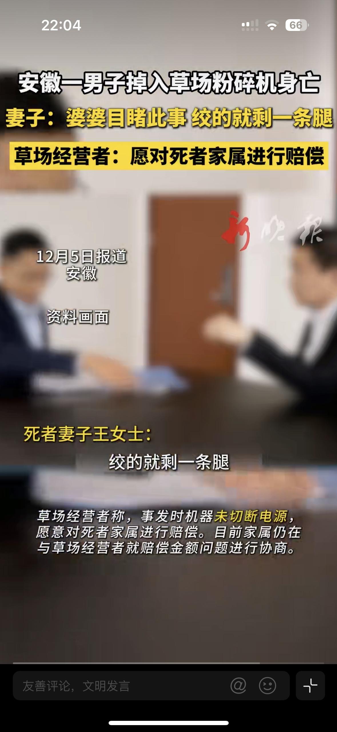该有多么绝望呀!短短几个字,就感觉身心不适! 她说:被绞的只剩下一条腿了!她的丈夫在草场维修粉碎机时,机器不知怎的意外启动了,把丈夫卷进了绞碎机里,只剩下了一条腿!婆婆也在那工作,目睹了全过程,那种血肉模糊的场面,简直毕生难忘!事发时机器未切断电源,正应了那句话,淹死的都是会水的!一定要注意安全呀,这种悲剧太痛苦了