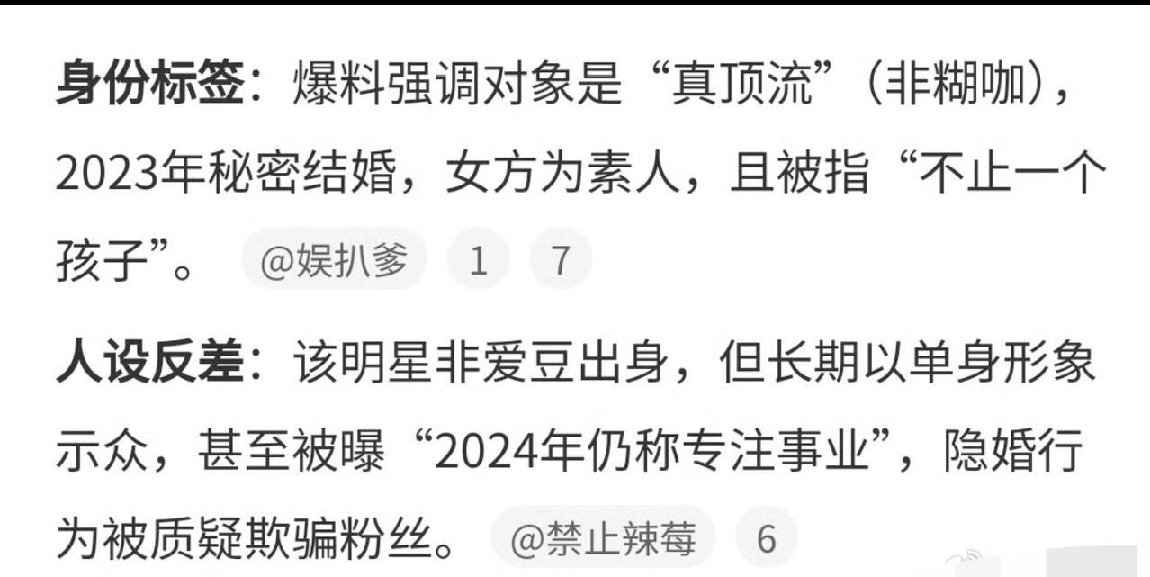 顶流,隐婚生子。 今天微博要炸了,一时间网友纷纷都成了大侦探。 不过真的好难猜,男方是真的顶流,女方是素人,据说还不止一个孩子。 其实也可以理解,不隐婚或许会影响事业。 继续蹲,不管是谁都祝福他。